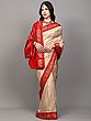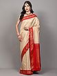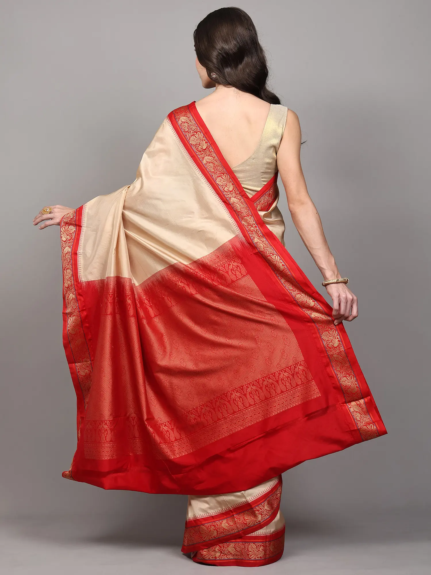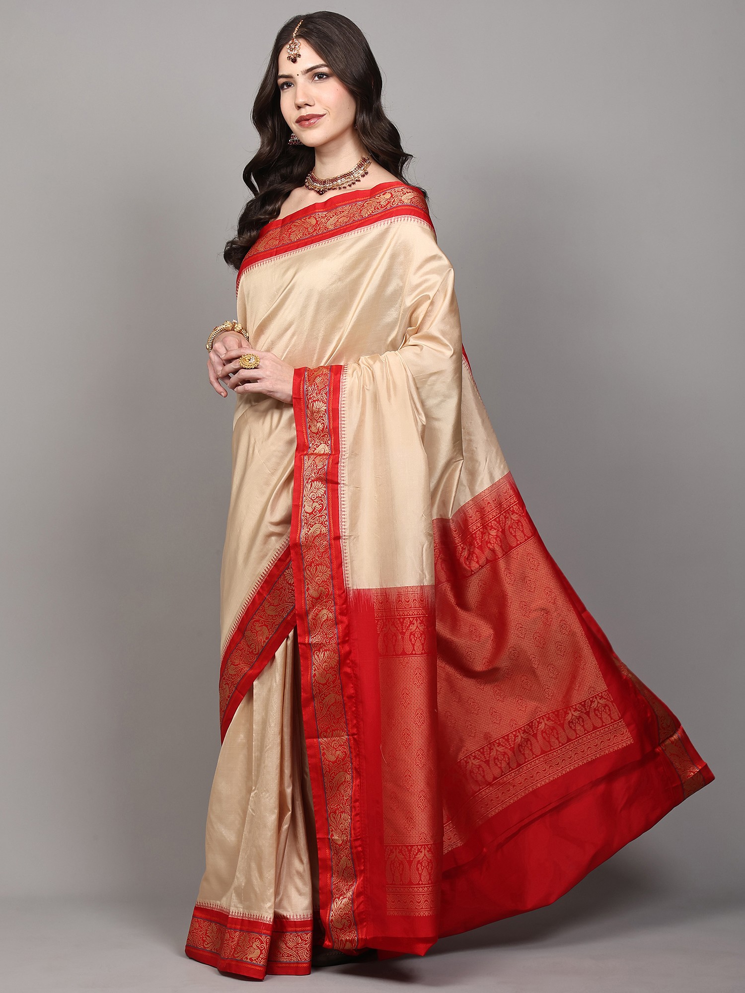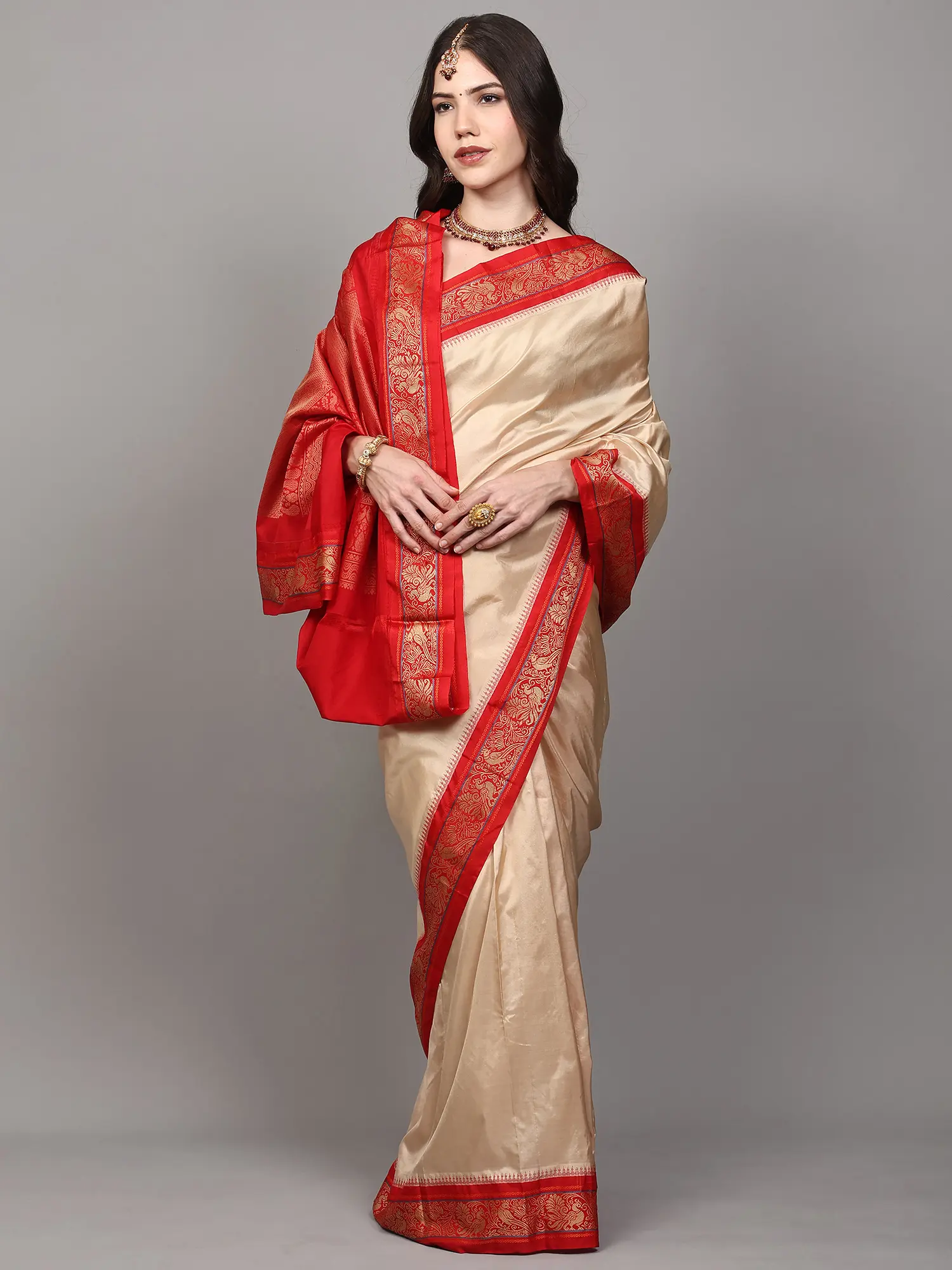Embrace timeless elegance with this exquisite art silk saree, a testament to the rich heritage of Indian textiles. The captivating "shifting-sand" hue of the saree's body evokes a sense of ethereal beauty and understated luxury. This versatile shade serves as the perfect canvas for the striking contrast temple border, rendered in a vibrant, auspicious red.