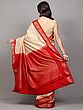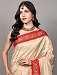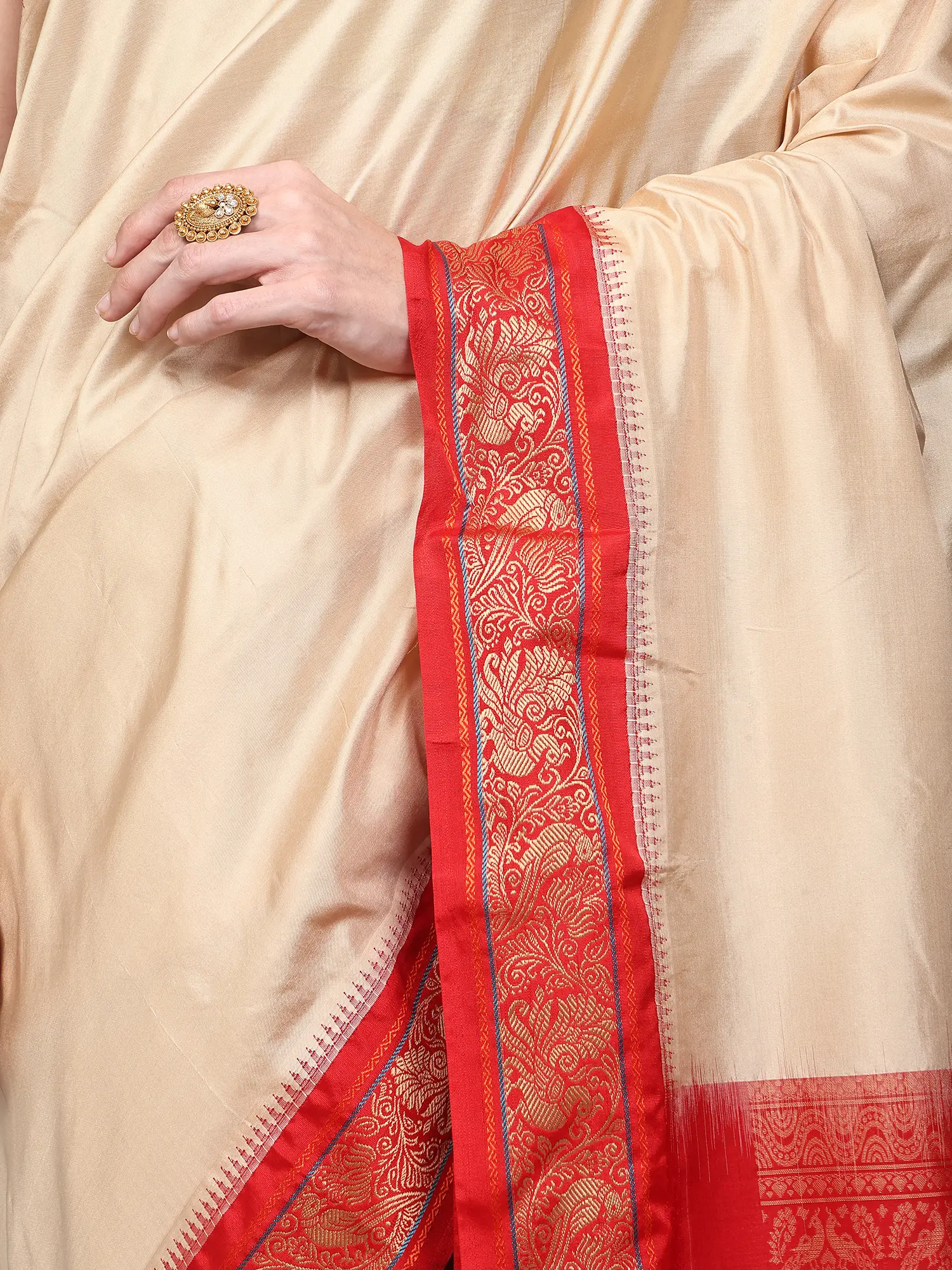 The border is the undisputed star of this creation. It features the classic "temple" motif, a design deeply rooted in traditional Indian temple architecture, symbolizing prosperity and auspiciousness. Each motif is meticulously woven with shimmering zari, a metallic thread that lends a magnificent sheen and opulence to the ensemble. Within this grand border, gracefully adorned peacocks come to life. These majestic birds, rendered in intricate zari work, symbolize beauty, grace, and good fortune, adding a regal touch to the saree. The juxtaposition of the rich red border against the subtle sand-colored silk creates a visually arresting effect, perfect for making a sophisticated statement.