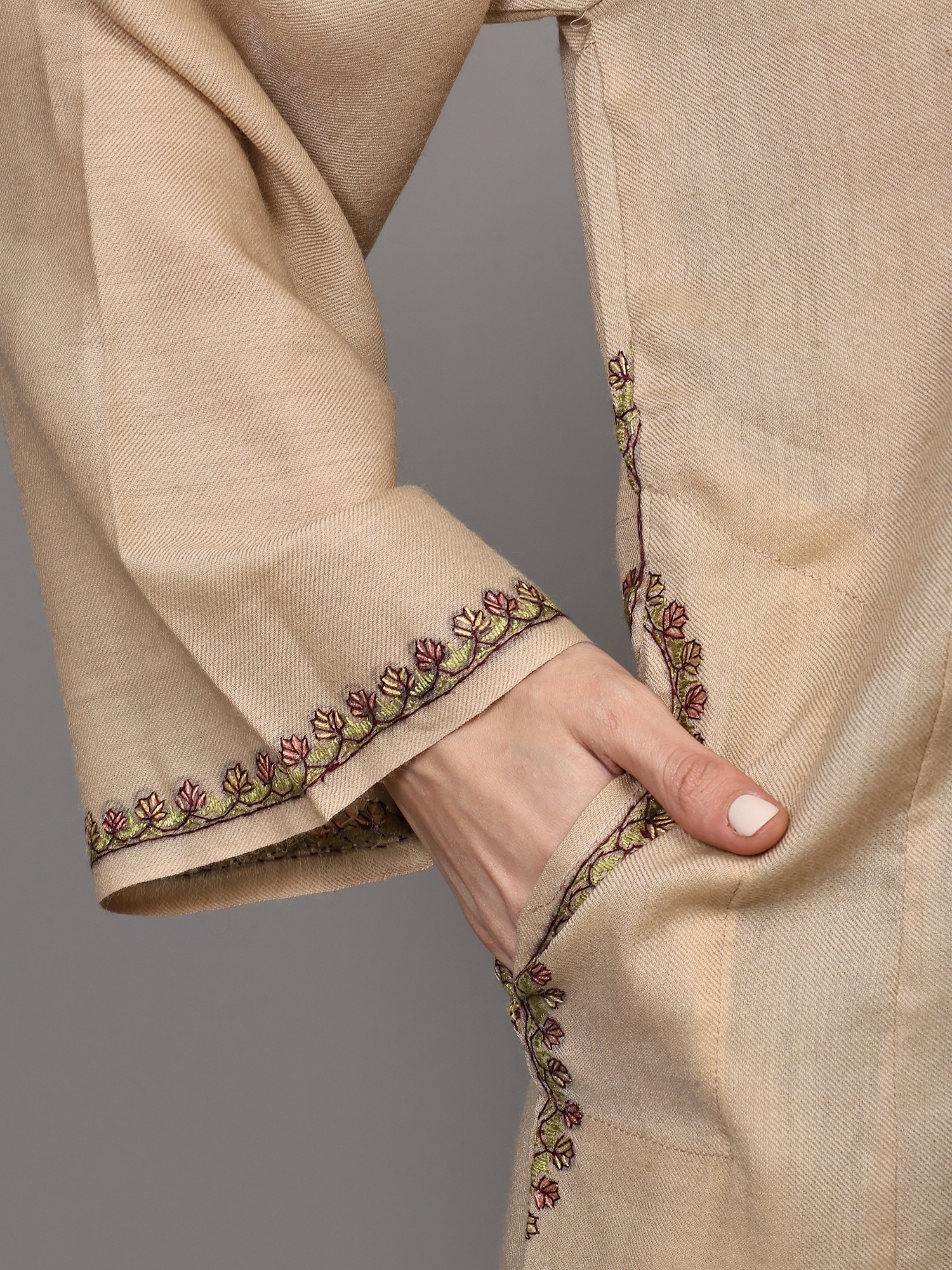 Wool Kashmiri Phiran with Aari Embroidered Paisleys on Neck and Side Pockets