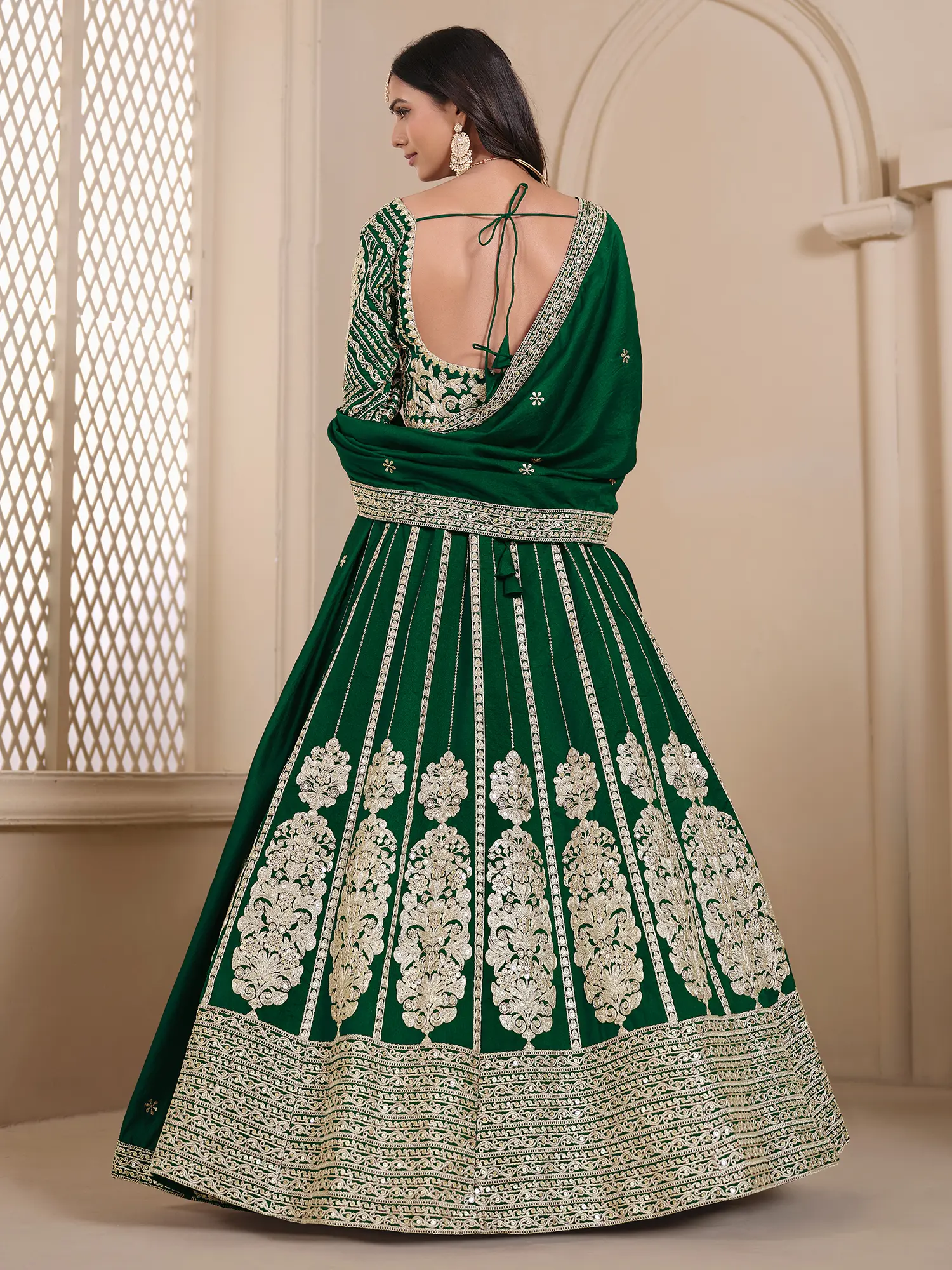 Bottle-Green Net Beads and Golden Thread Embroidery Lehenga Choli with Cutwork Dupatta