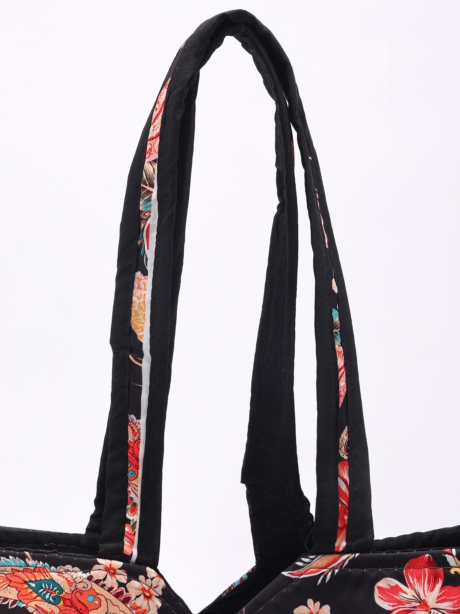 Make a bold statement with this stunning shopper bag, a perfect fusion of functionality and eye-catching design. The deep black canvas serves as the ideal backdrop for a riot of vibrant, multicolor paisleys and floral motifs. Each intricate detail of the pattern bursts with life, featuring rich reds, warm oranges, bright blues, and delicate creams, creating a dynamic and visually captivating aesthetic. This bag isn't just an accessory; it's a wearable piece of art that adds a touch of bohemian flair and artistic charm to any outfit. Whether you're heading to the market, a day trip, or simply running errands, this shopper bag ensures you do so with undeniable style. ––––––––––