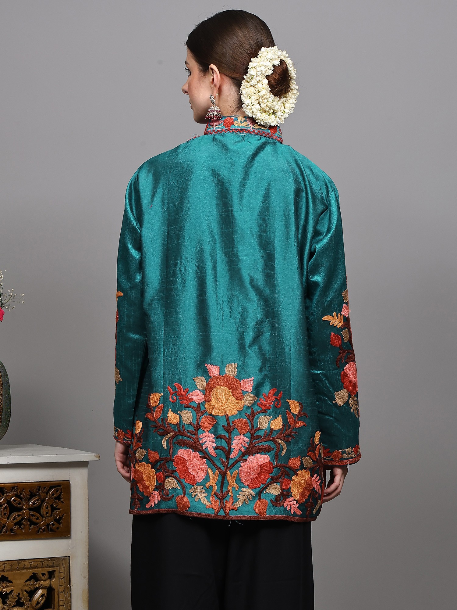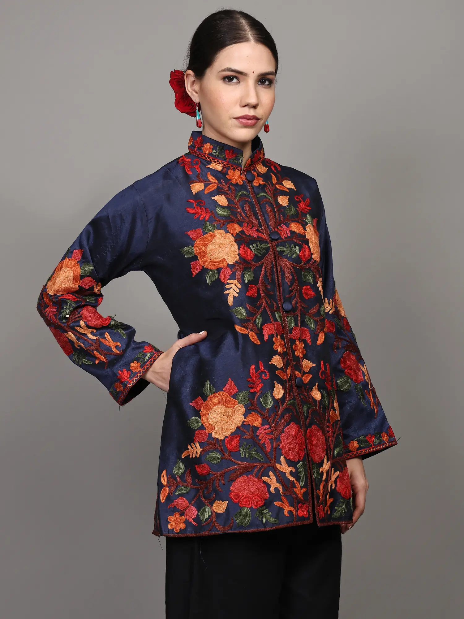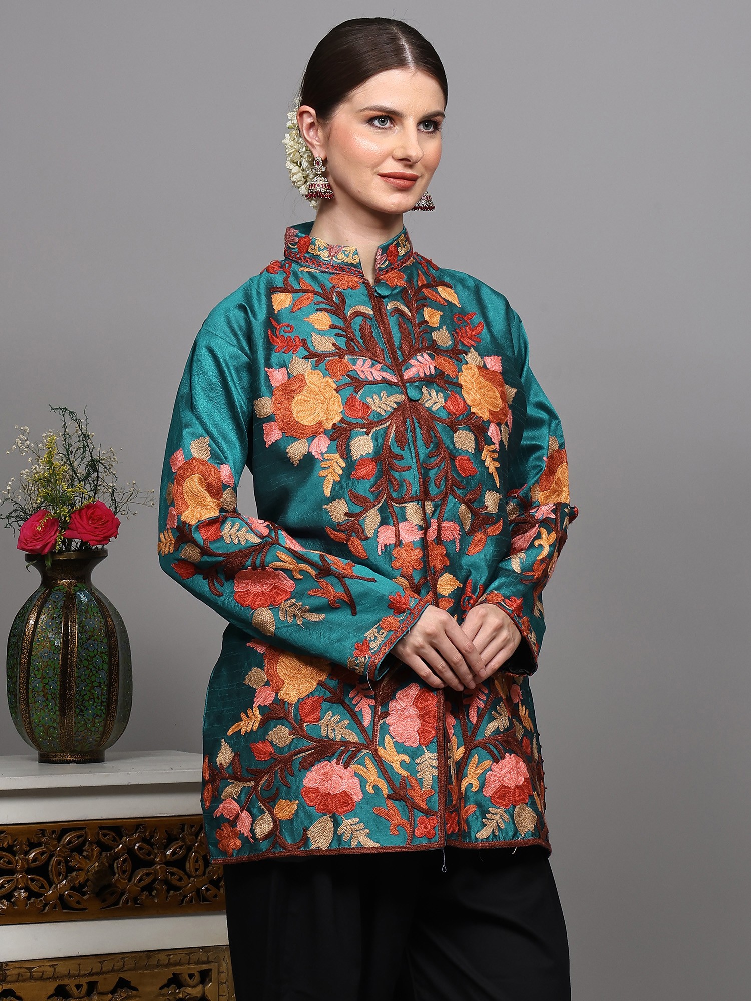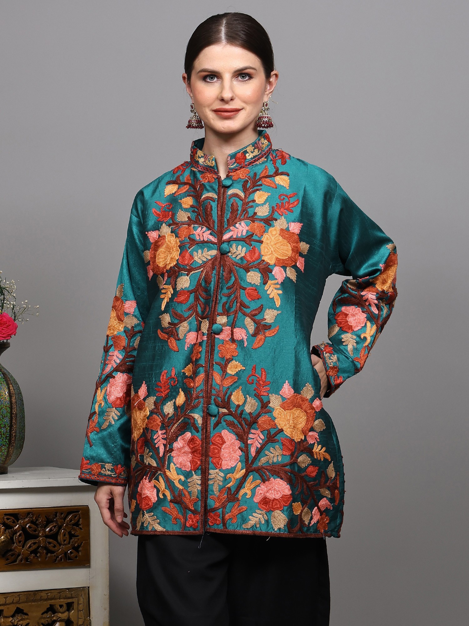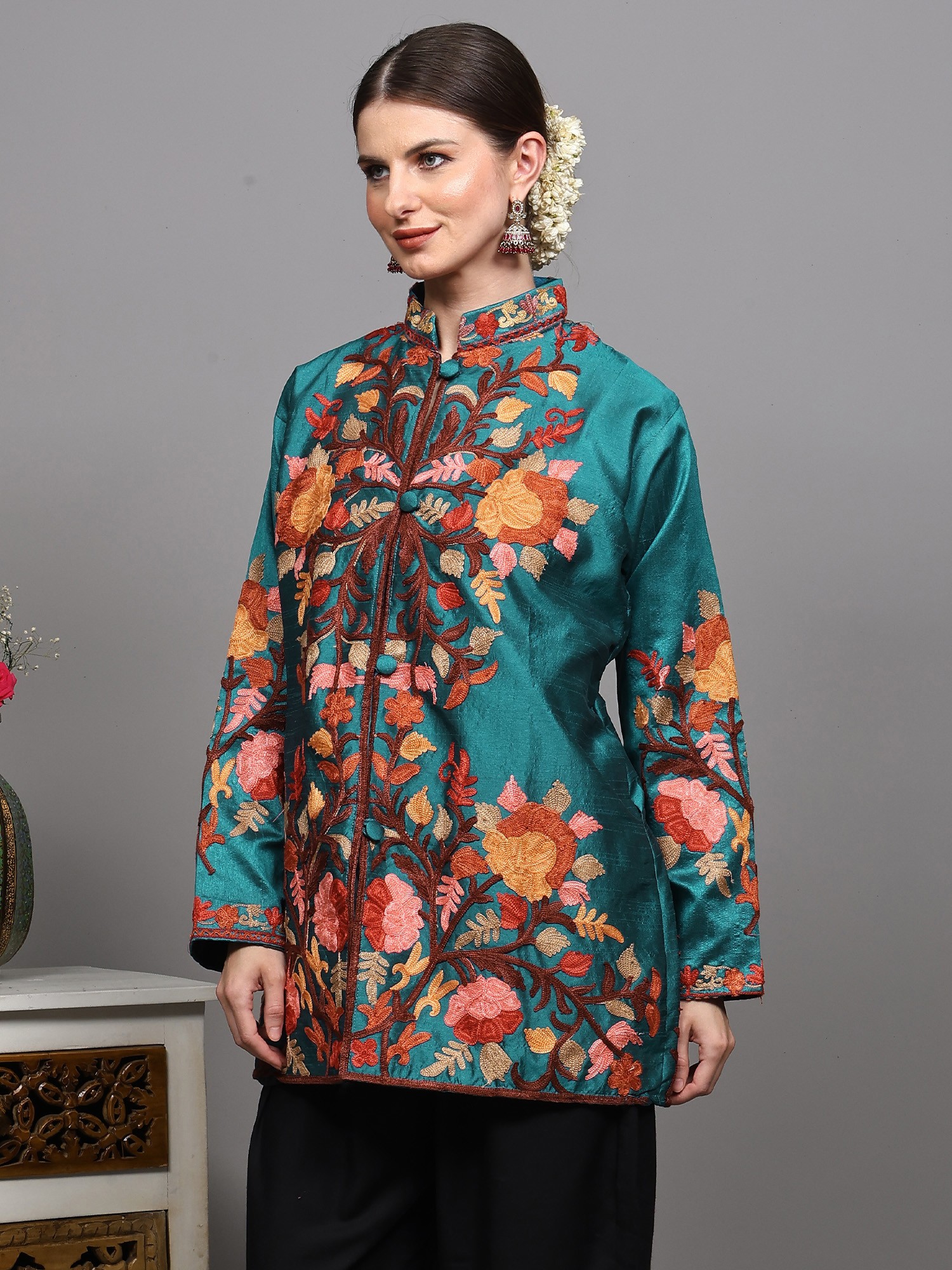 Kashmiri Short Jacket with Aari Embroidered Maple Leaves on All-over