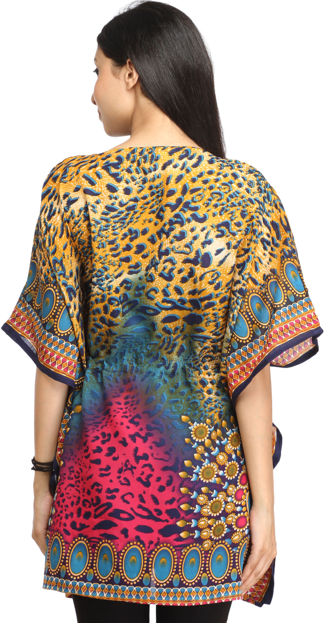 This “Short Kaftan” (a loose and flowing garment) is an epitome of untamed beauty. Made from luxurious viscose, it drapes effortlessly, embracing your curves with a touch of exotic allure.