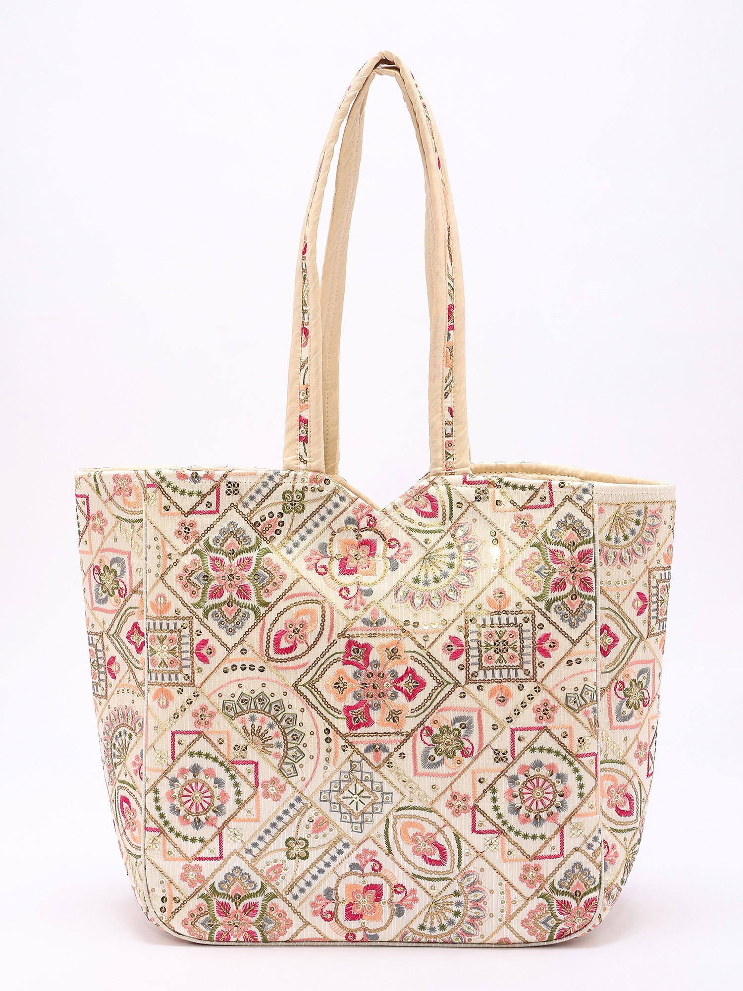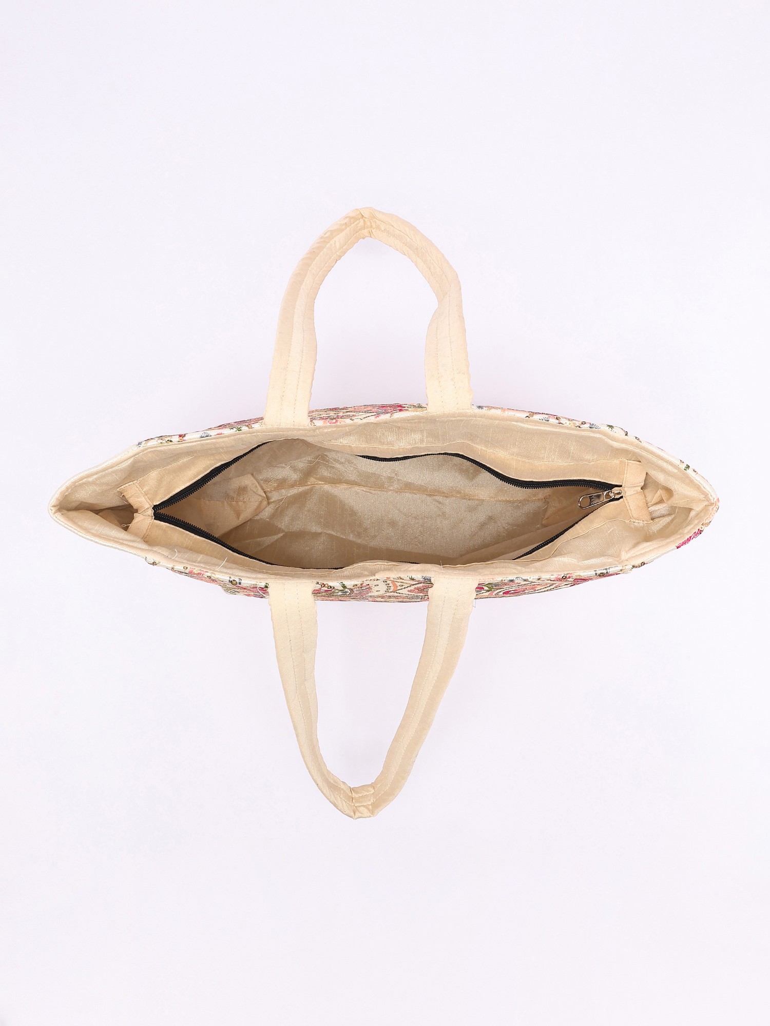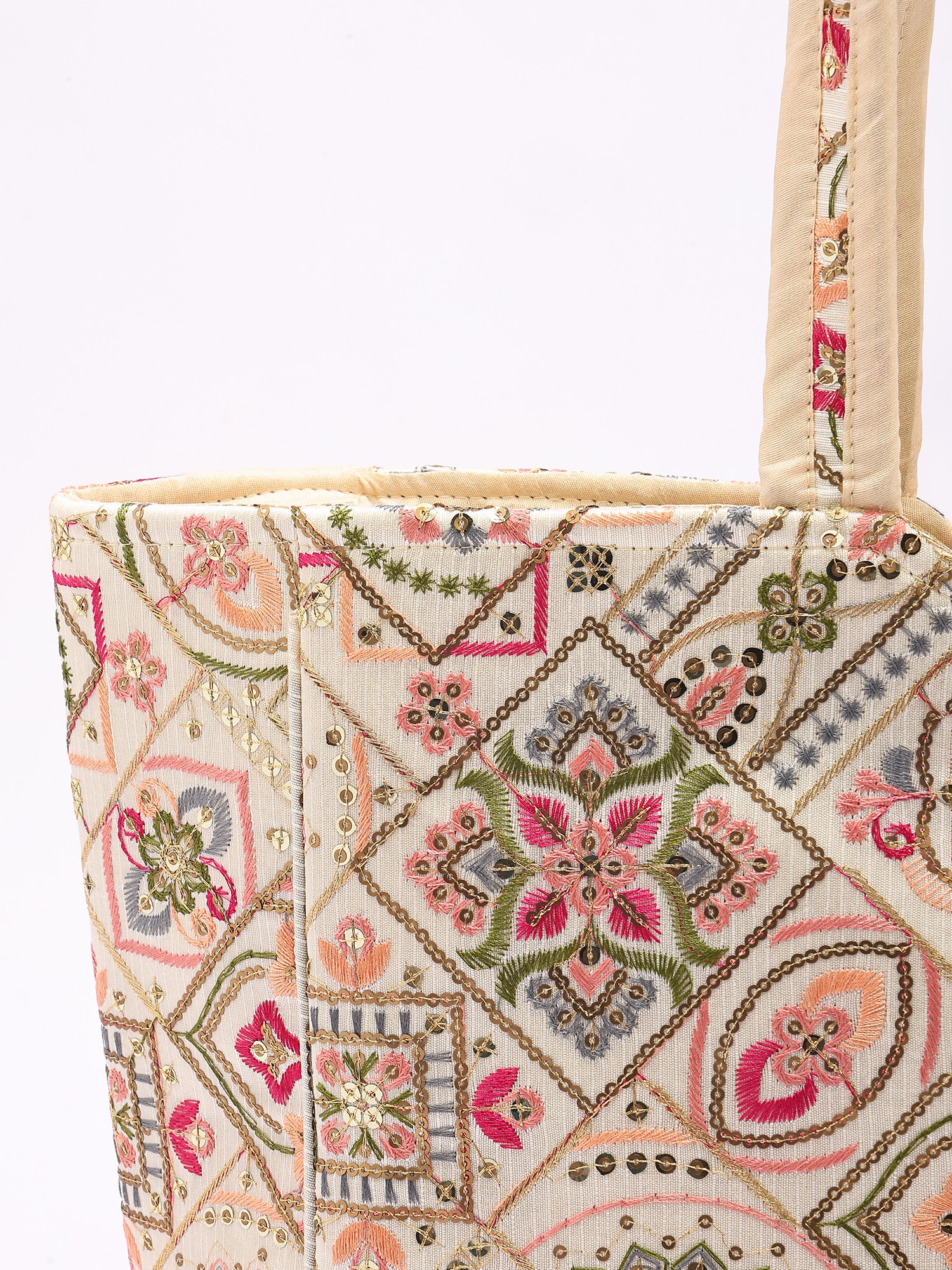 Multi-Color Shopper Bag with Metallic Thread Embroidered Flowers and Paisleys