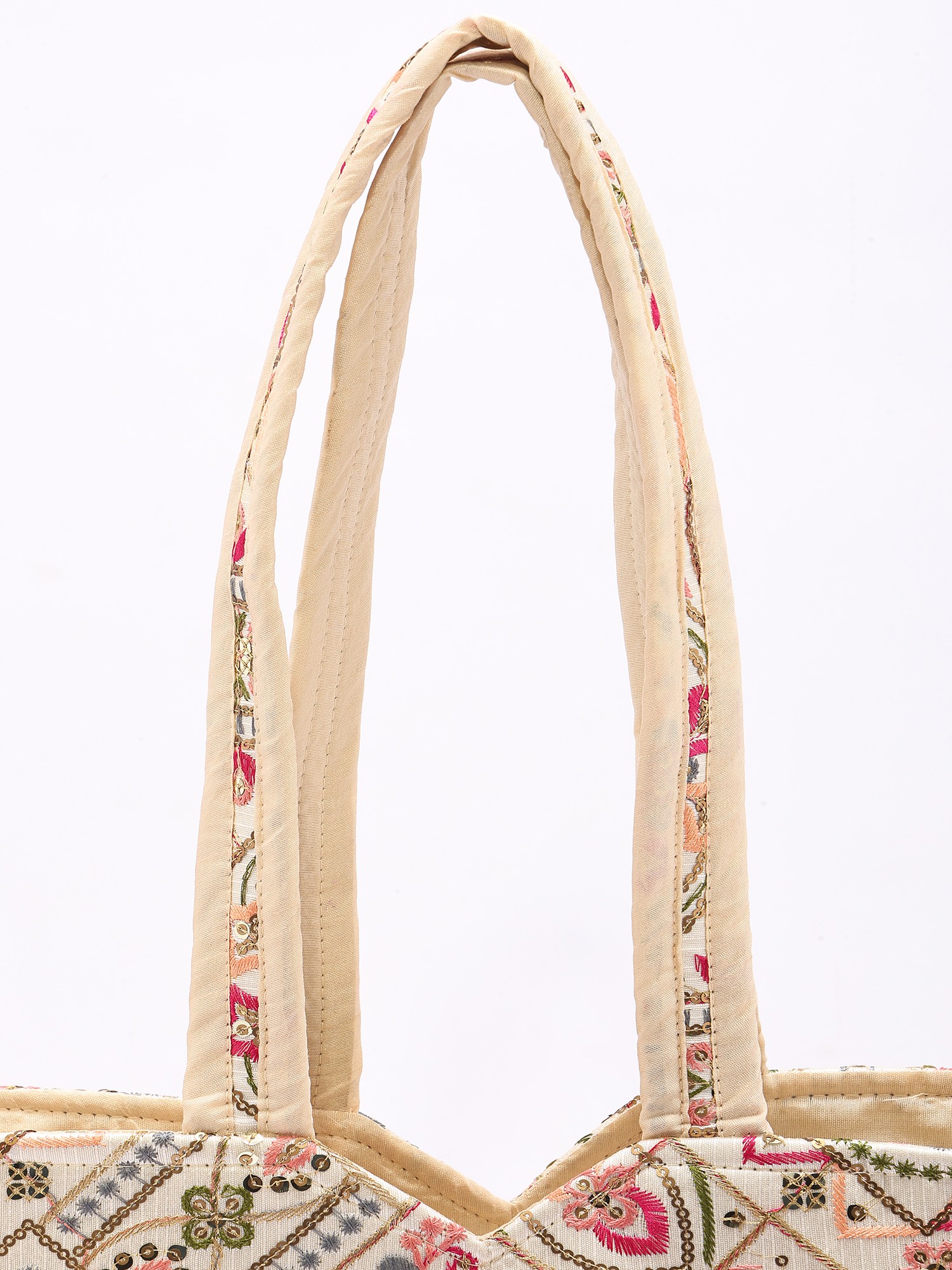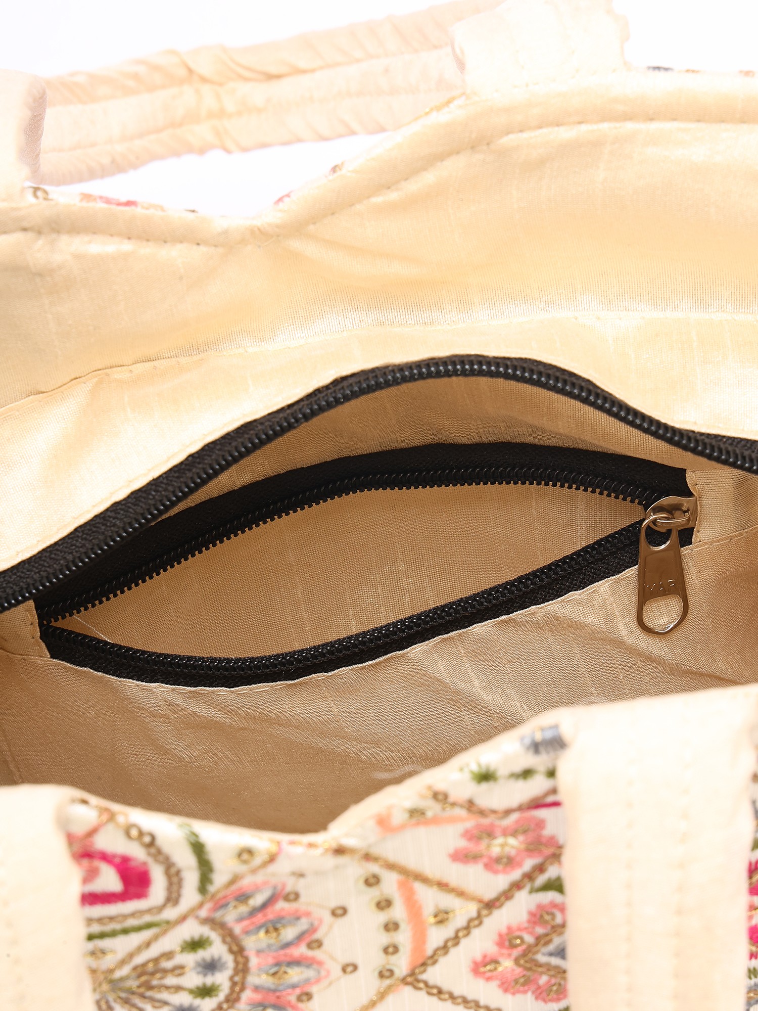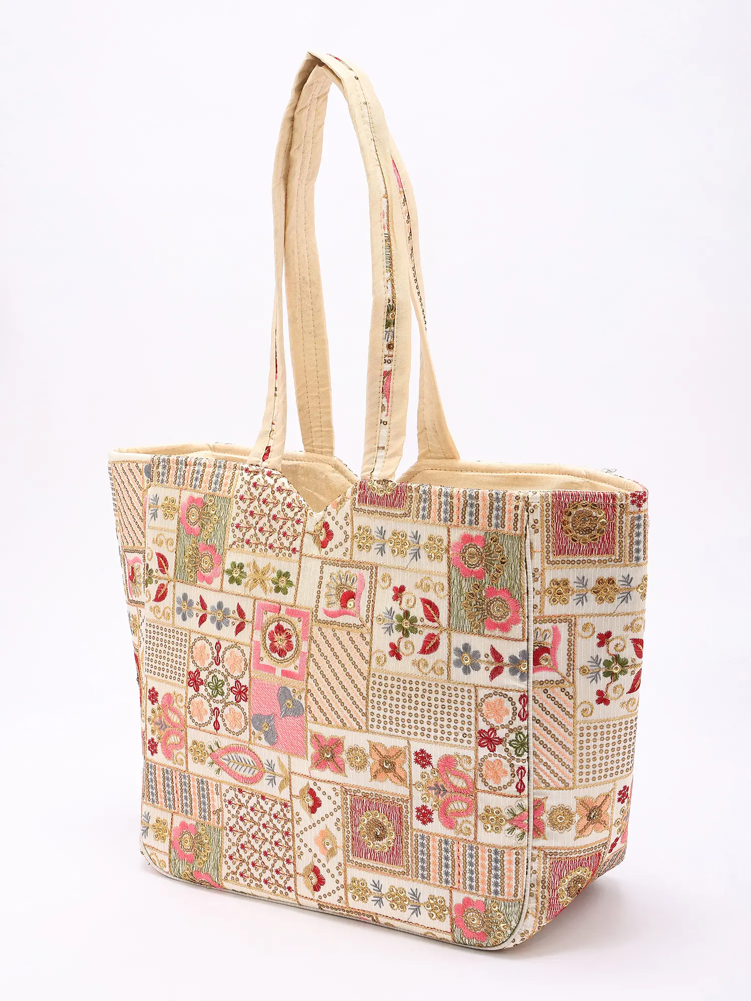 Multi-Color Shopper Bag with Metallic Thread Embroidered Flowers and Paisleys