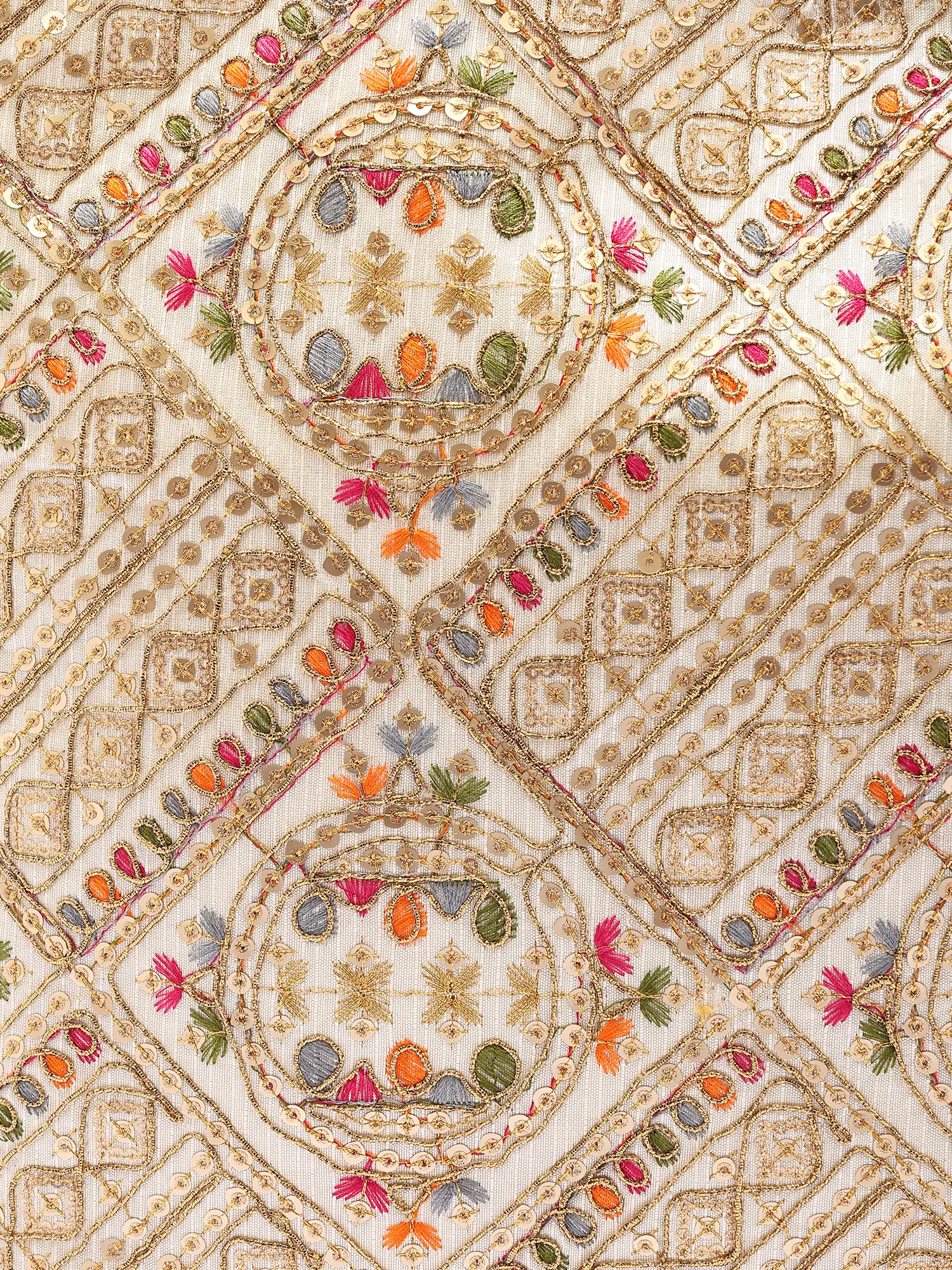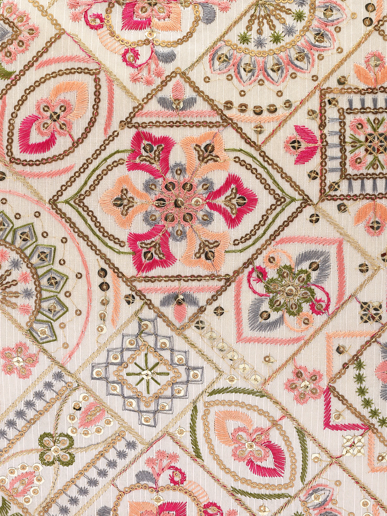 Embrace the artistry of Kutch with this exquisite shoulder tote bag, a testament to traditional craftsmanship and modern style. Each bag is a canvas of intricate Zari and sequin embroidery, inspired by the rich cultural heritage of the Kutch region in Gujarat, India. The detailed work features a captivating mosaic of floral motifs, geometric patterns, and delicate floral sprays, all meticulously rendered in vibrant threads of pink, green, coral, and gold. The shimmering sequins catch the light, adding a touch of glamour and sophistication to this unique accessory. ––––––––––––––––––