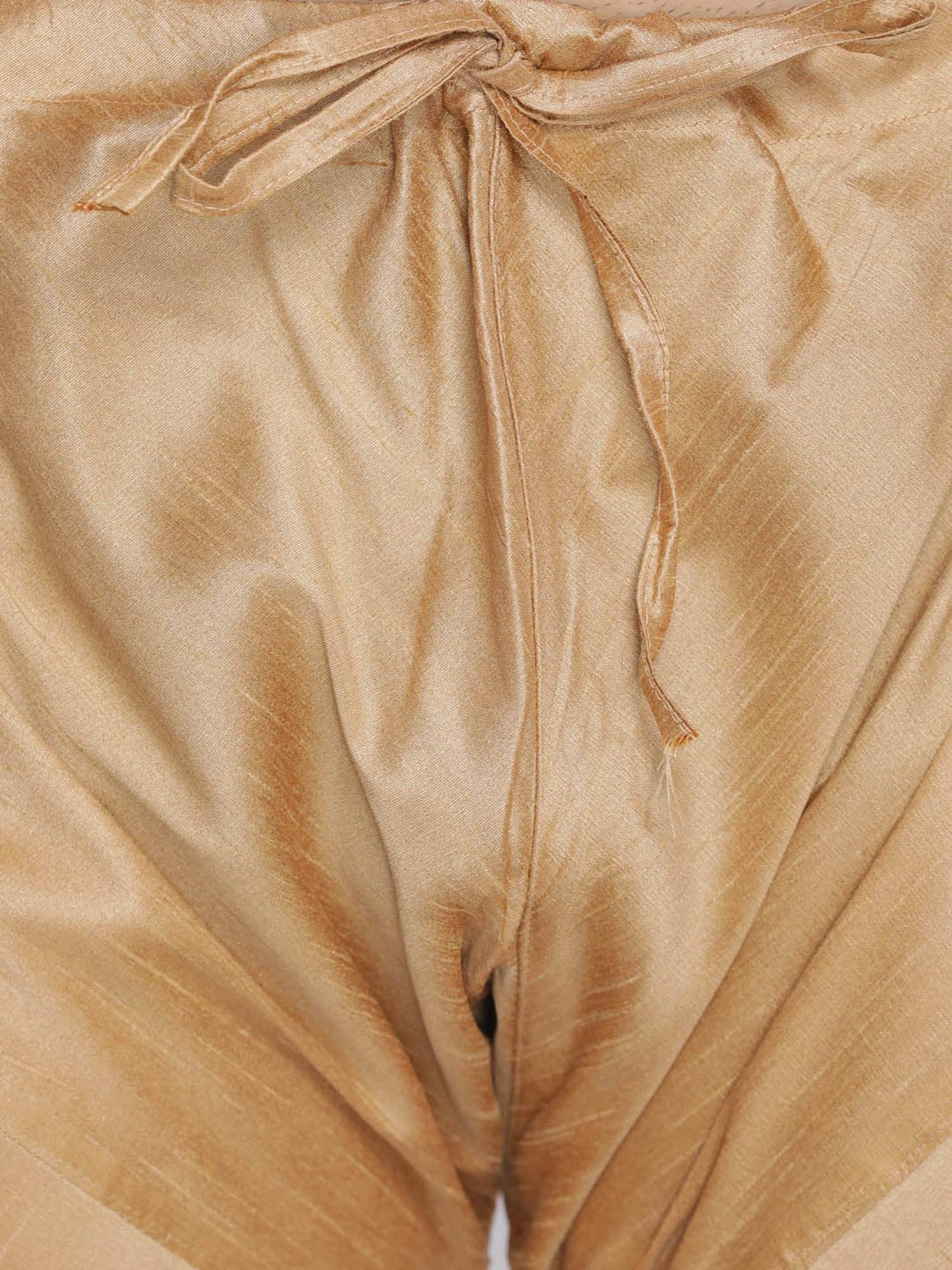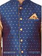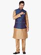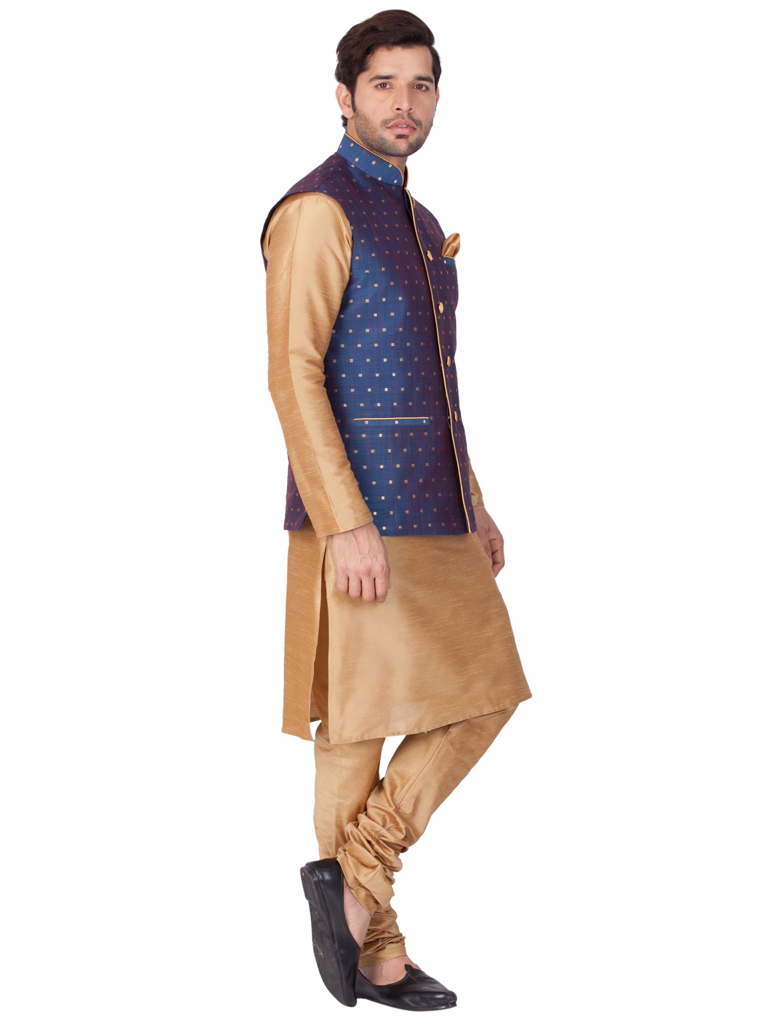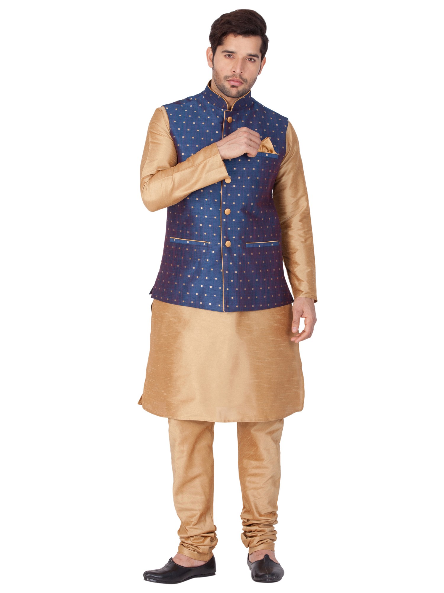 Introducing you to this opulent silk blend golden kurta paired with a churidar pajama, complemented by a modi jacket in navy blue. This ensemble embodies the epitome of refinement and luxury. Crafted from the finest silk blend, the golden kurta exudes regal elegance, while the accompanying churidar pajama adds a touch of traditional sophistication.