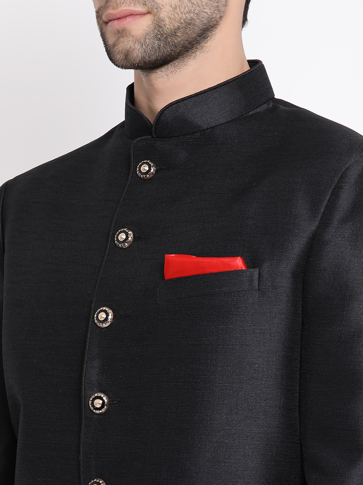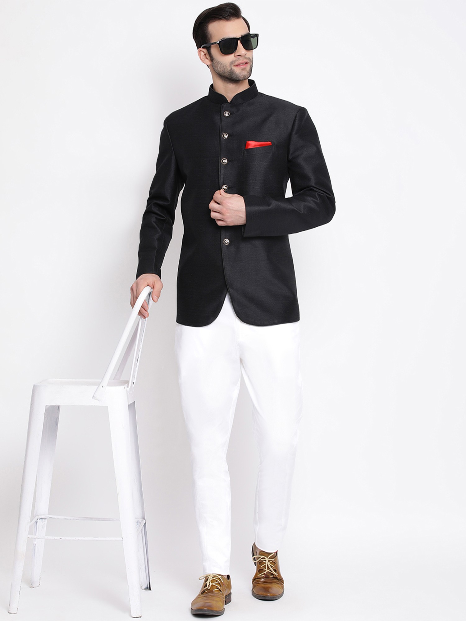 Jodhpuri coats have always symbolized regalia and grace. It was named after the famous place Jodhpur, the epicenter of monarchy in Rajasthan. Princes of many royal families wore this coat on important occasions. This Silk Blend Jodhpuri Coat featuring Designer Buttons is a tribute to the royalty of Jodhpur and their contribution to India's fashion industry. Crafted from a luxurious silk blend, this exquisite coat embodies sophistication and opulence. The unique design showcases meticulous detailing and a tailored fit, ensuring a refined silhouette. The designer buttons add a distinctive touch, elevating the overall aesthetic. Ideal for formal occasions or cultural celebrations, this Jodhpuri coat seamlessly fuses tradition with modern style. Whether paired with ethnic wear or contemporary ensembles, make a statement in this ensemble that captures the essence of regality and impeccable craftsmanship in every stitch and button.