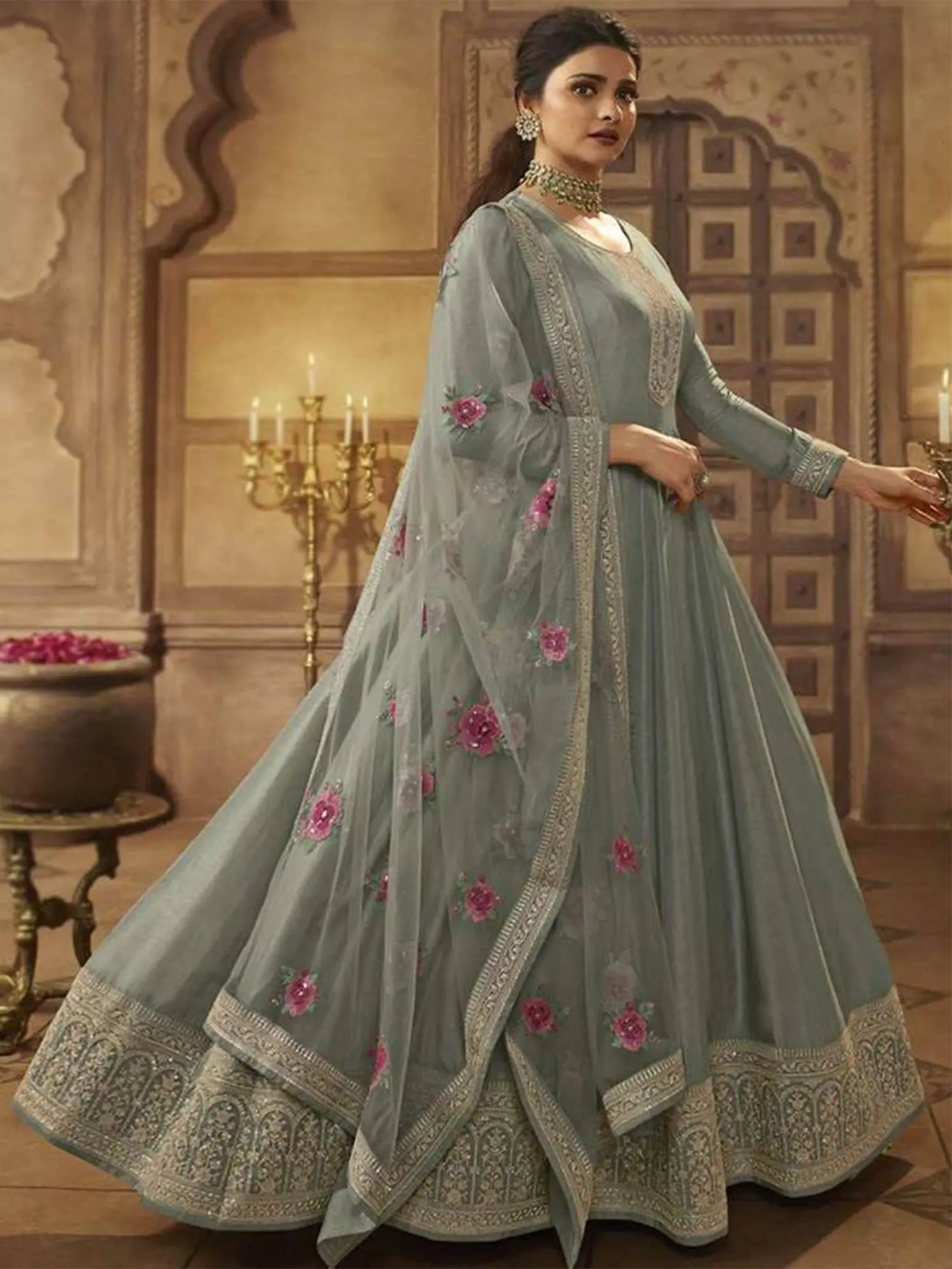 Immerse yourself in the captivating allure of this exquisite Anarkali gown. The gentle, flowing silhouette is designed to enhance your natural grace, while intricate details elevate the design to a realm of sophisticated beauty. This piece is more than just clothing; it's a statement of timeless elegance and cultural richness. Crafted from luxurious silk, the gown drapes beautifully, creating a flattering and comfortable fit. The fabric's subtle sheen adds a touch of understated glamour, making it perfect for both daytime celebrations and evening events. Its fluidity allows for graceful movement, ensuring you feel confident and poised with every step.