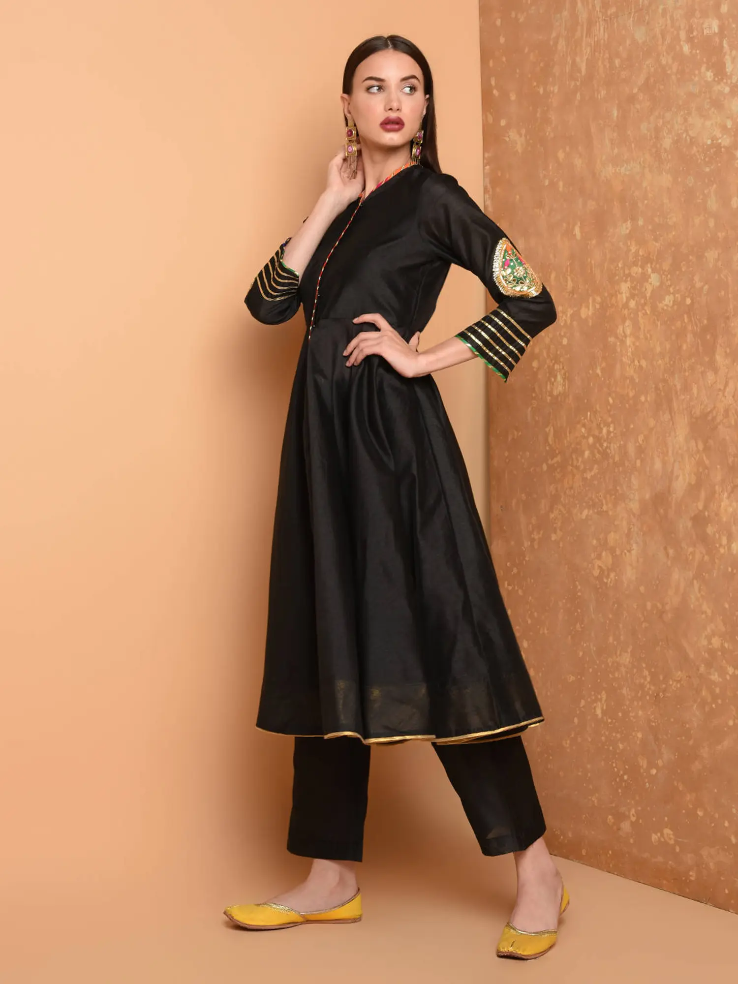 This stunning kurta is perfectly complemented by a pair of matching silk trousers. Designed for both comfort and style, the trousers offer a streamlined, modern silhouette that balances the volume of the flared kurta. The rich silk fabric ensures a luxurious feel against the skin, while the coordinated design creates a cohesive and polished look. This set is ideal for those seeking an ensemble that is both traditional and contemporary, suitable for weddings, festive gatherings, or upscale parties. Accessorize with statement earrings and a chic clutch to complete this captivating look.