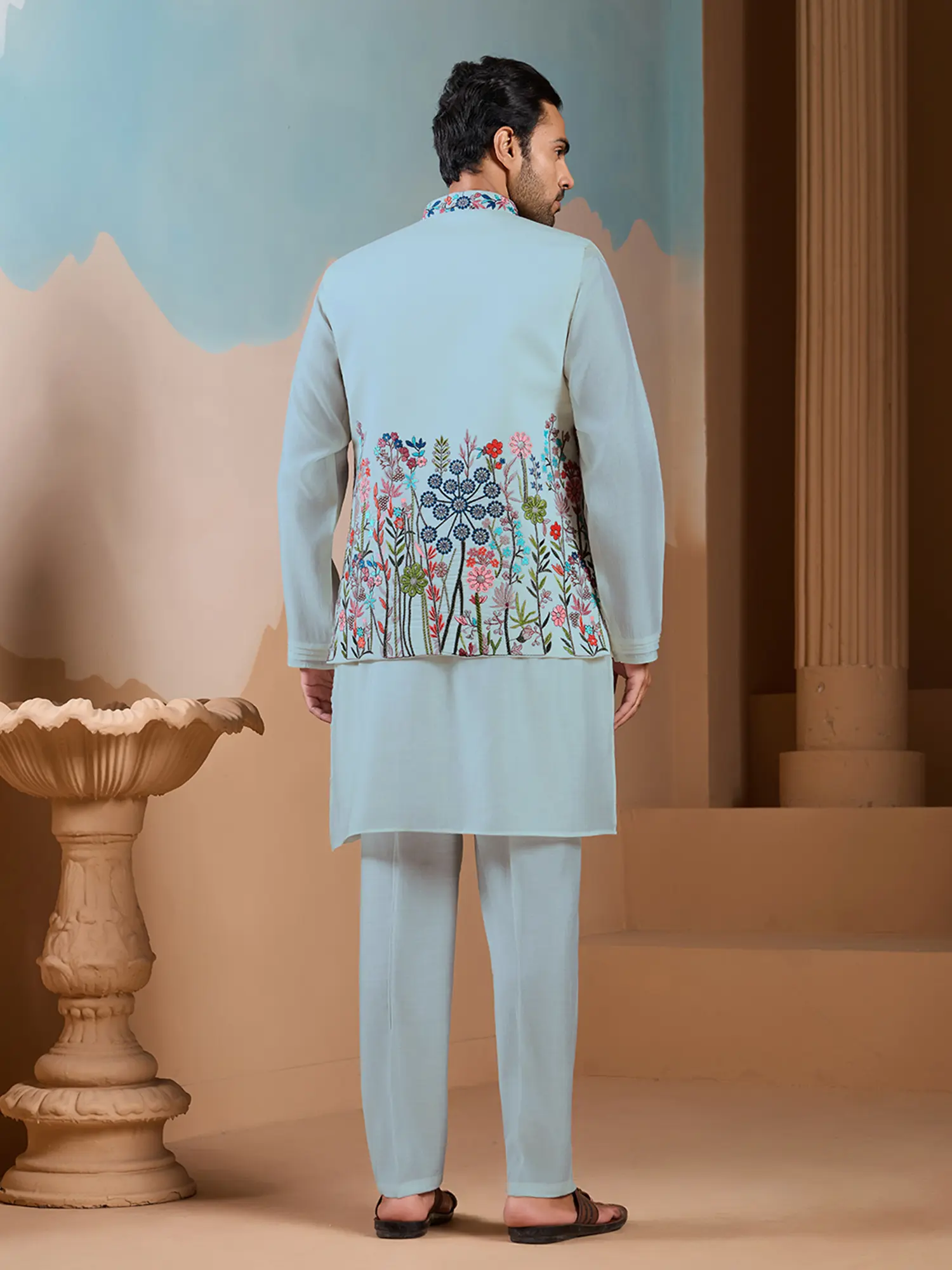 Robin-Egg Blue Bandgala Kurta Set with All-Over Weave and Threadwork