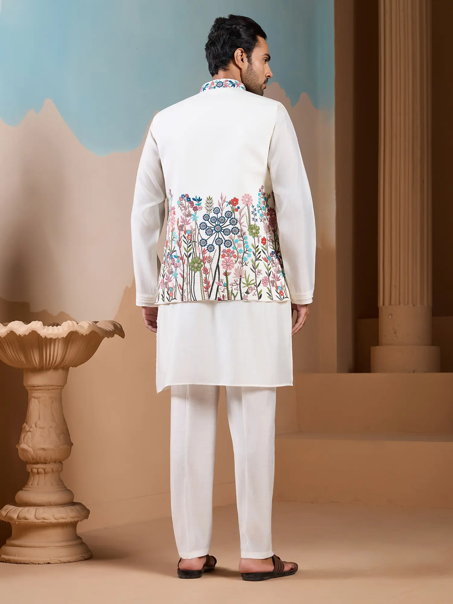 Wedding Kurta Pajama Set with All-Over Woven Floral Motifs in Self