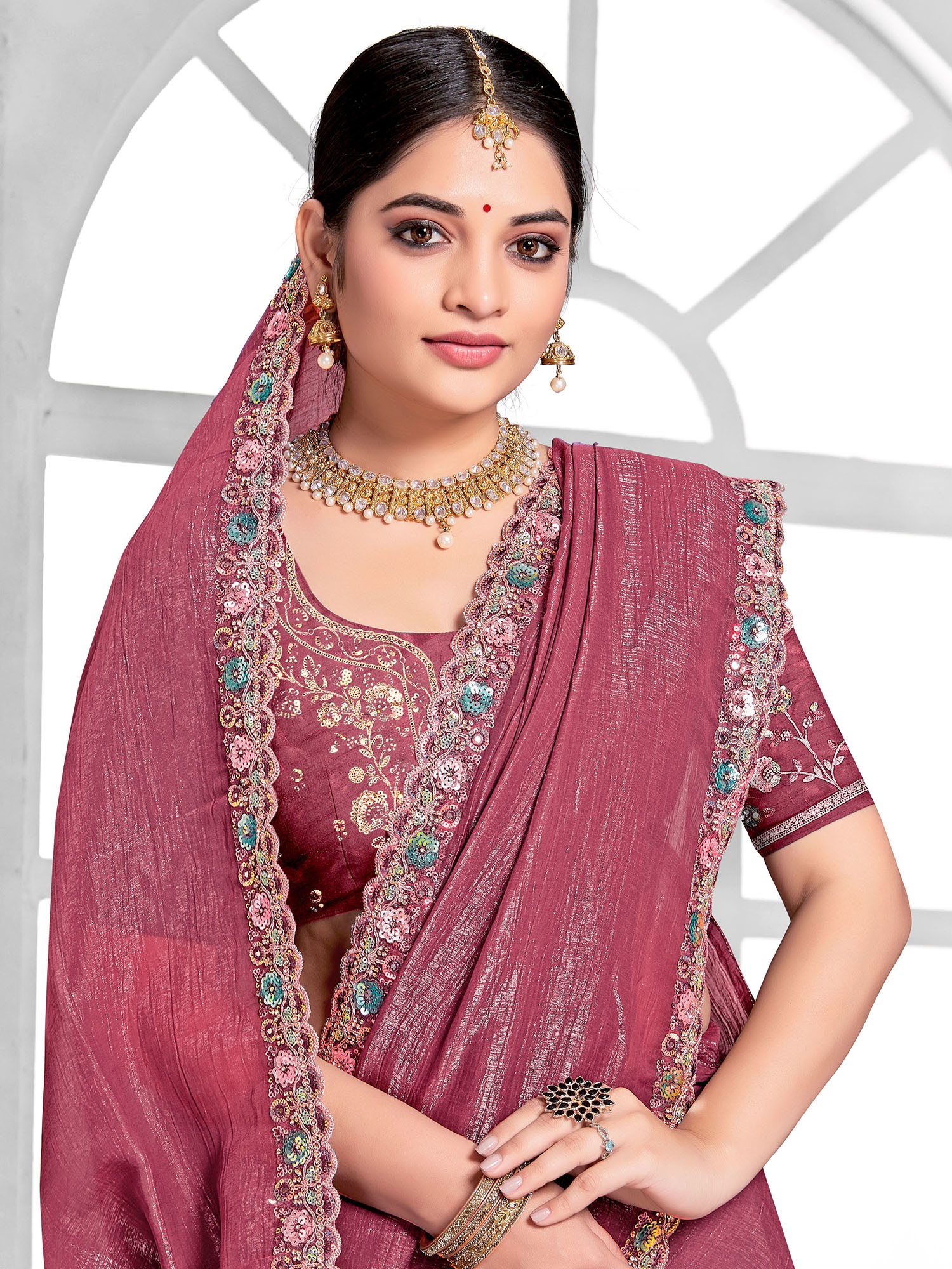 This saree is a true masterpiece, designed to make you the center of attention at any gathering. The shimmering silk fabric drapes beautifully, offering both comfort and elegance. The rich color of the saree provides a sophisticated backdrop for the intricate sequins and embroidery work that adorns its border. These delicate embellishments catch the light with every movement, adding a touch of glamour and sparkle to your look. The detailed craftsmanship is evident in every stitch, reflecting a commitment to quality and timeless style.