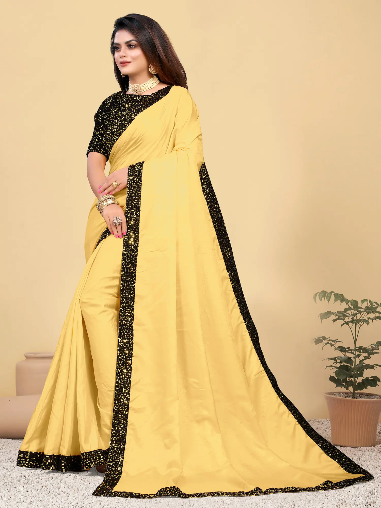 Solitary-Star Kantha-Sequins Embroidered Crepe Saree with Floral Vines