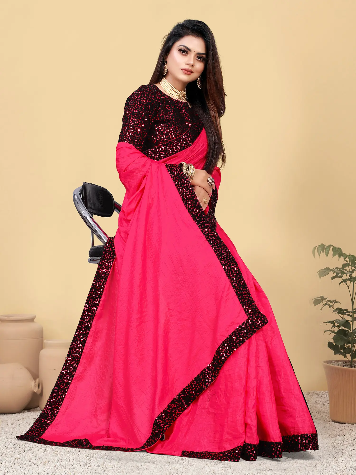 Flame-Orange Sequins work Crepe Saree with Kantha Embroidered Flowers