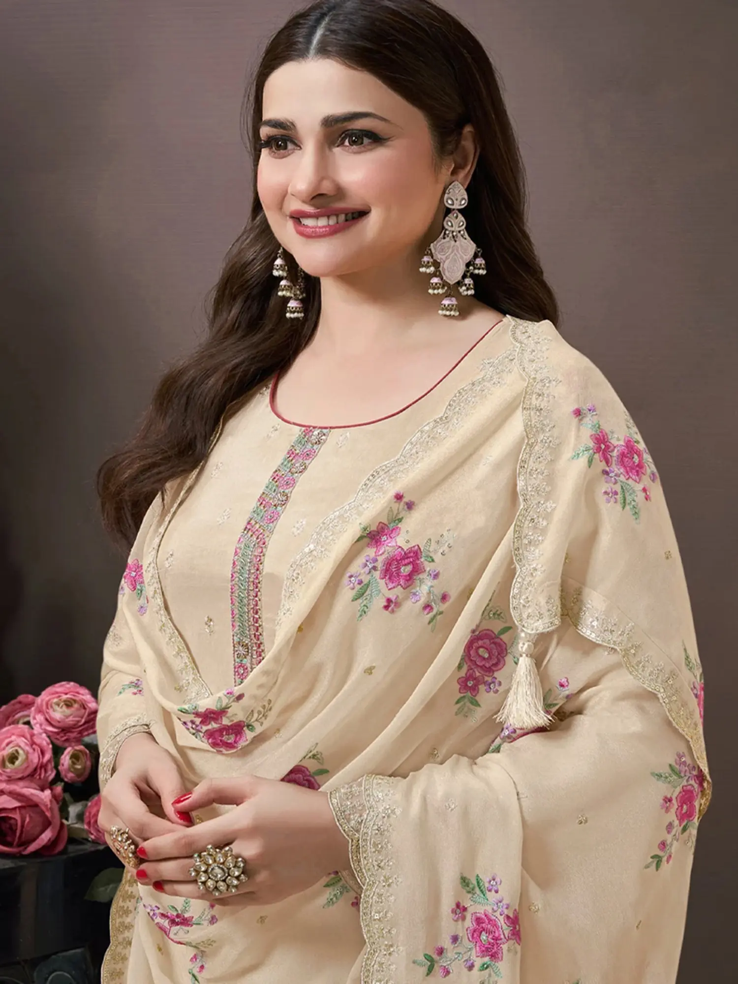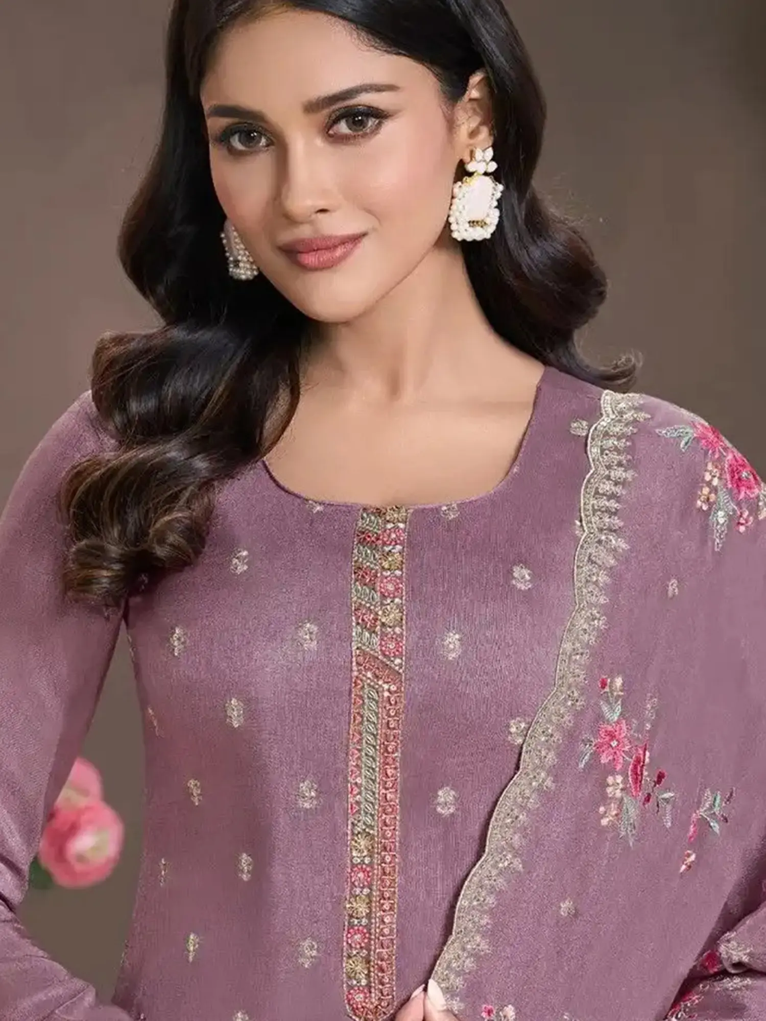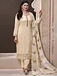 Chinon Silk Pant Style Suit with Colorful Dupatta and Heavy Embroidery on Front Side Neck