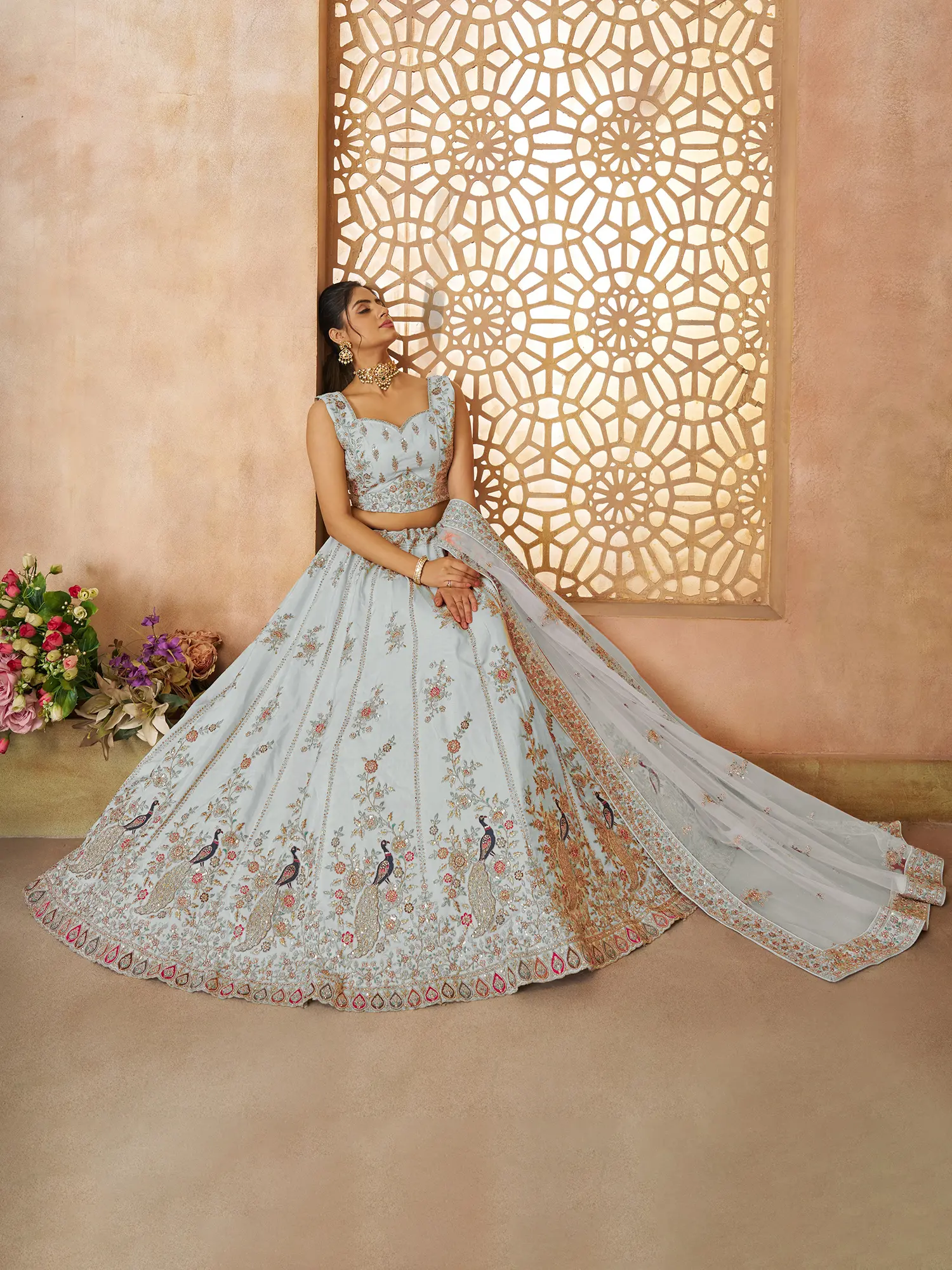 Light-Pink Soft Net Thread Embroidered Lehenga Choli with Sheer Dupatta