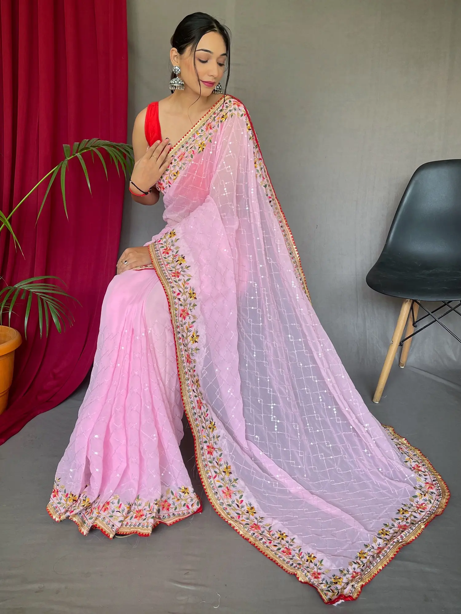 The true masterpiece of this saree lies in its breathtaking border. A meticulously embroidered floral motif, bursting with vibrant hues of reds, yellows, and greens, frames the entire drape. Interspersed within the intricate embroidery are countless tiny sequins that catch the light, adding a dazzling sparkle to your ensemble. This detailed work creates a rich tapestry that speaks volumes of traditional craftsmanship and contemporary flair, making it the perfect choice for any celebratory occasion.