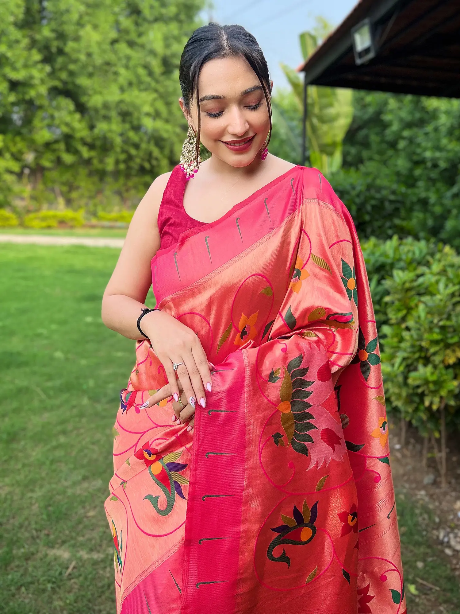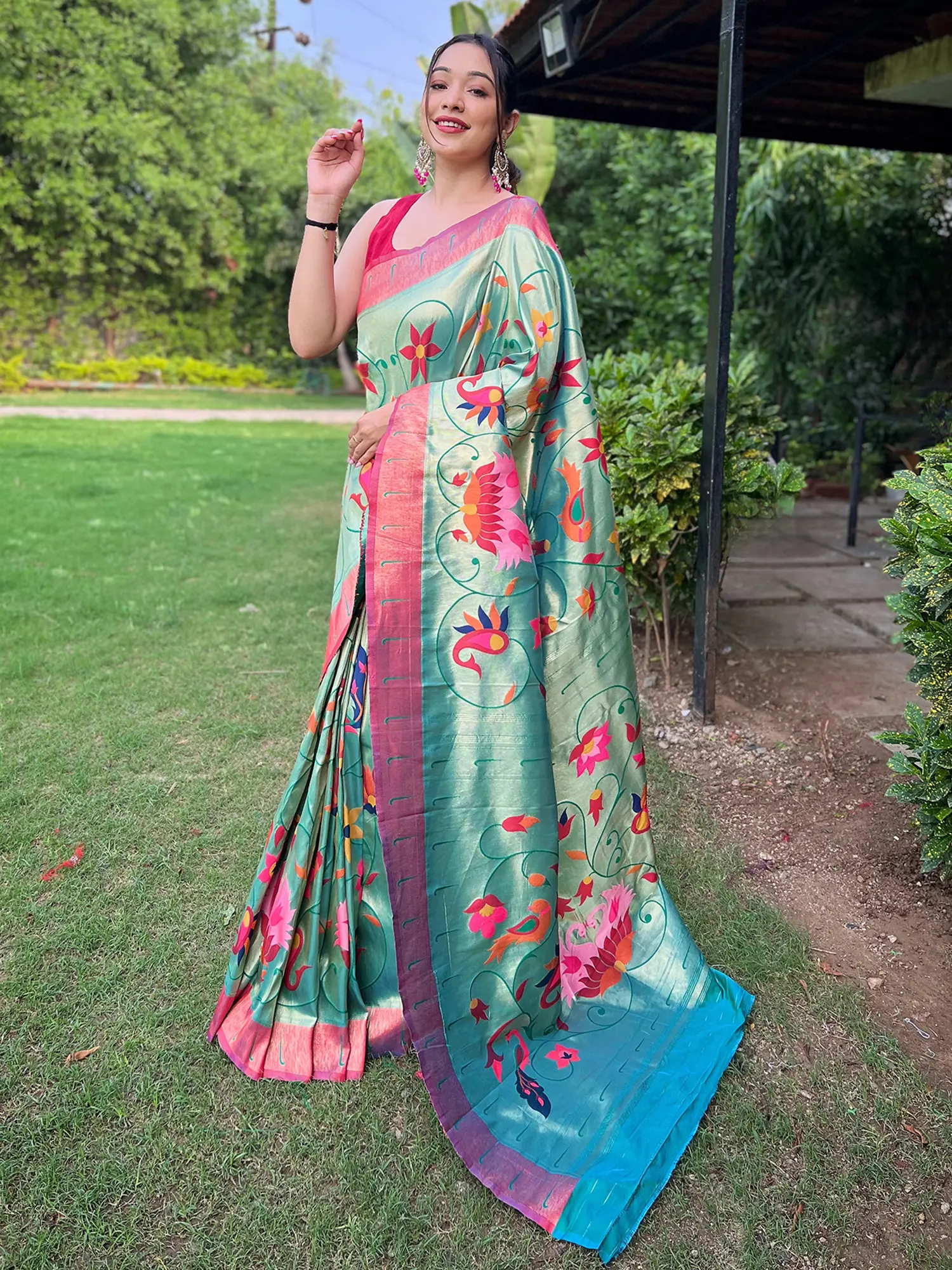 Designed with the modern woman in mind, this saree is ideal for various celebratory events, from weddings and receptions to festive gatherings and formal parties. Its unique blend of traditional weaving techniques and contemporary design ensures you'll stand out with effortless grace. The vibrant floral pattern makes it a cheerful yet sophisticated choice for daytime events, while its inherent luxury suits evening celebrations perfectly. Complement it with statement jewelry and classic footwear to complete your regal look. This saree is more than just an outfit; it's an experience, a connection to rich cultural traditions, and a symbol of refined taste.