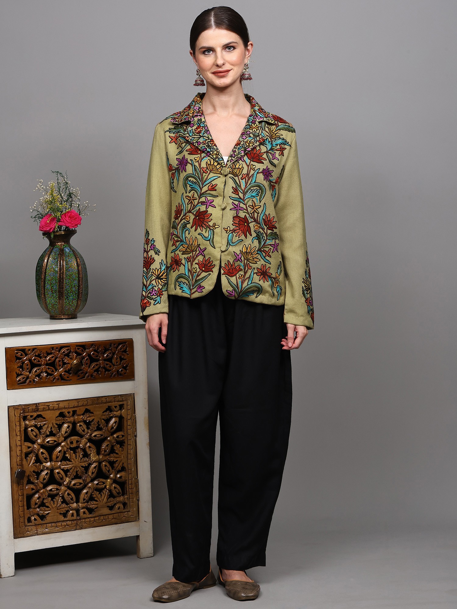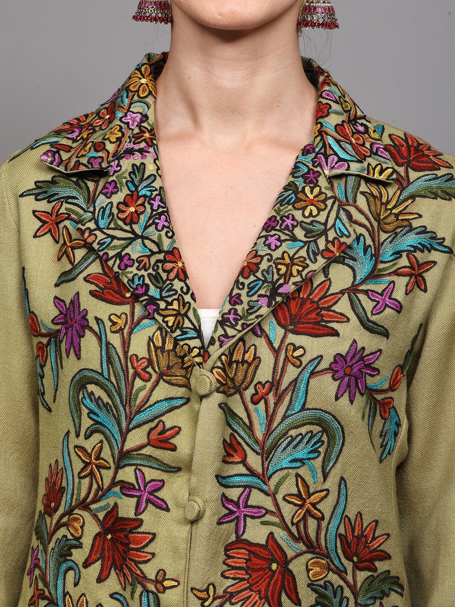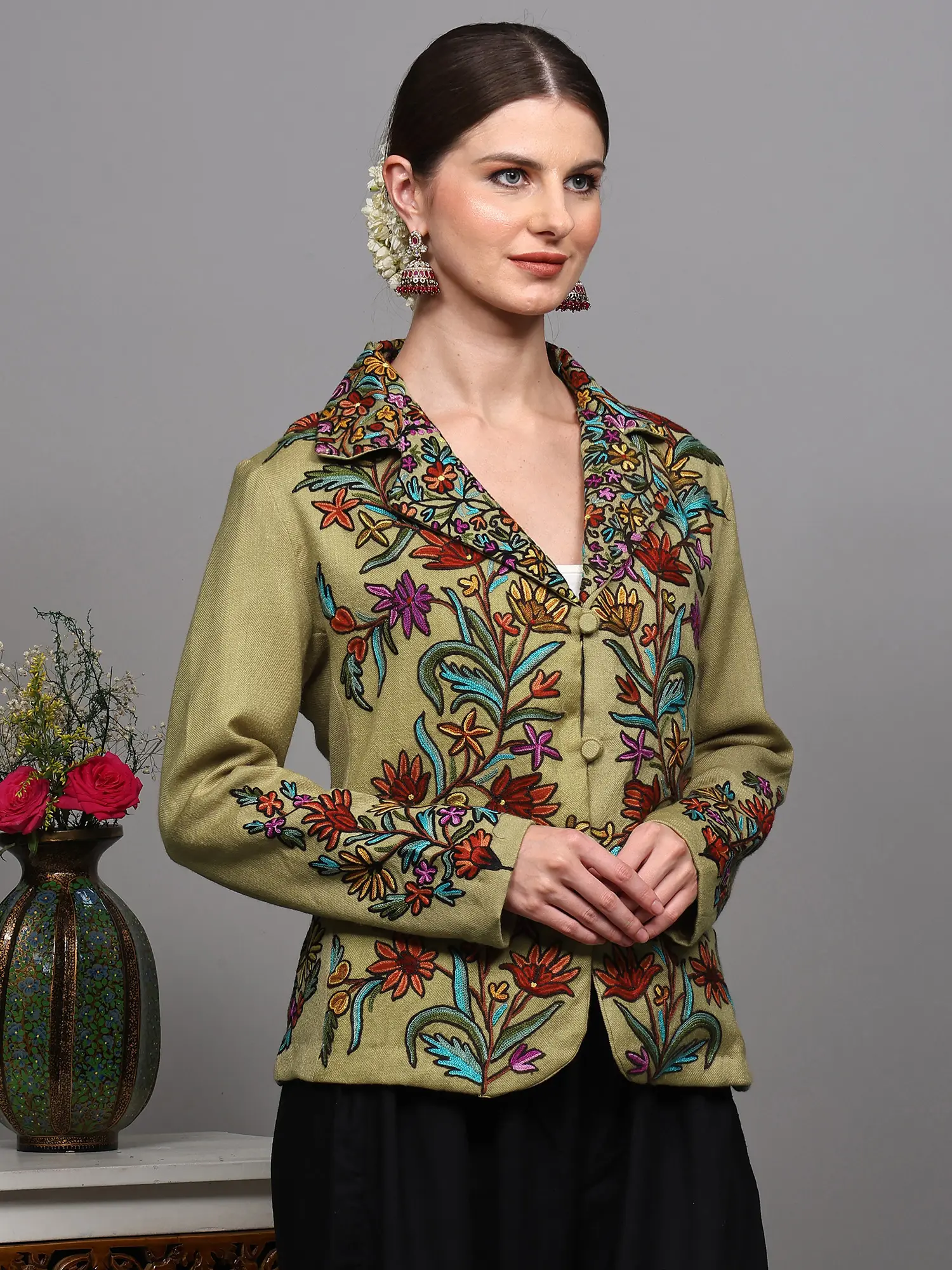 Alpine-Green Wool Short Jacket with Aari Embroidered Floral Vines and Side Pockets from Kashmir