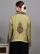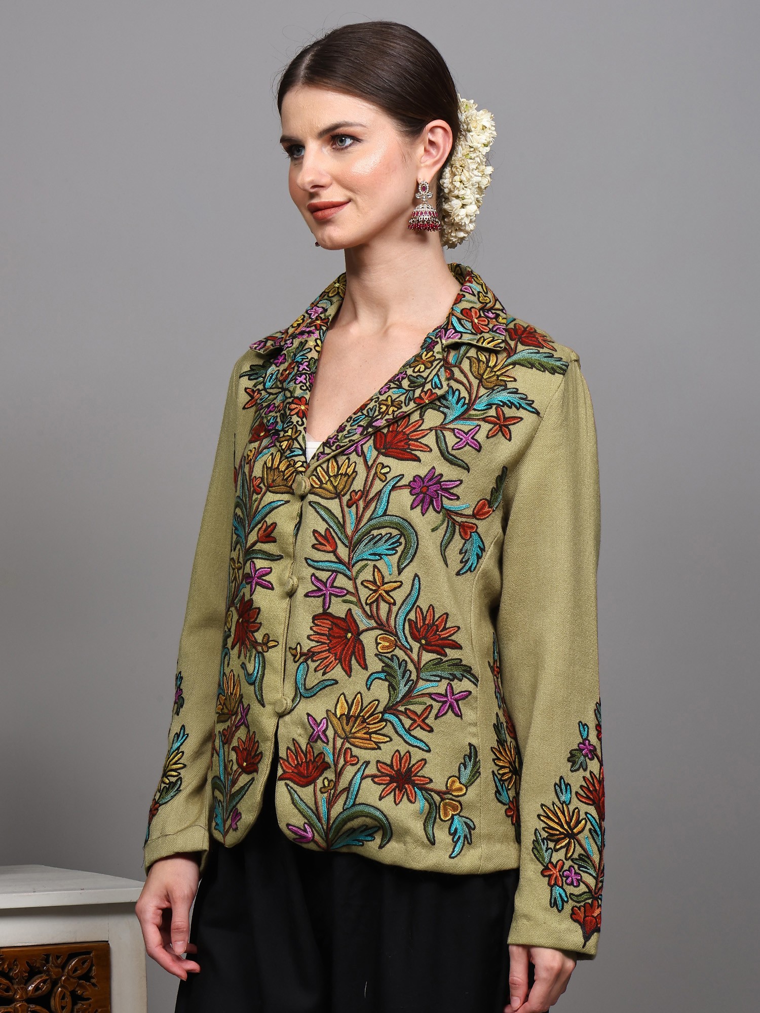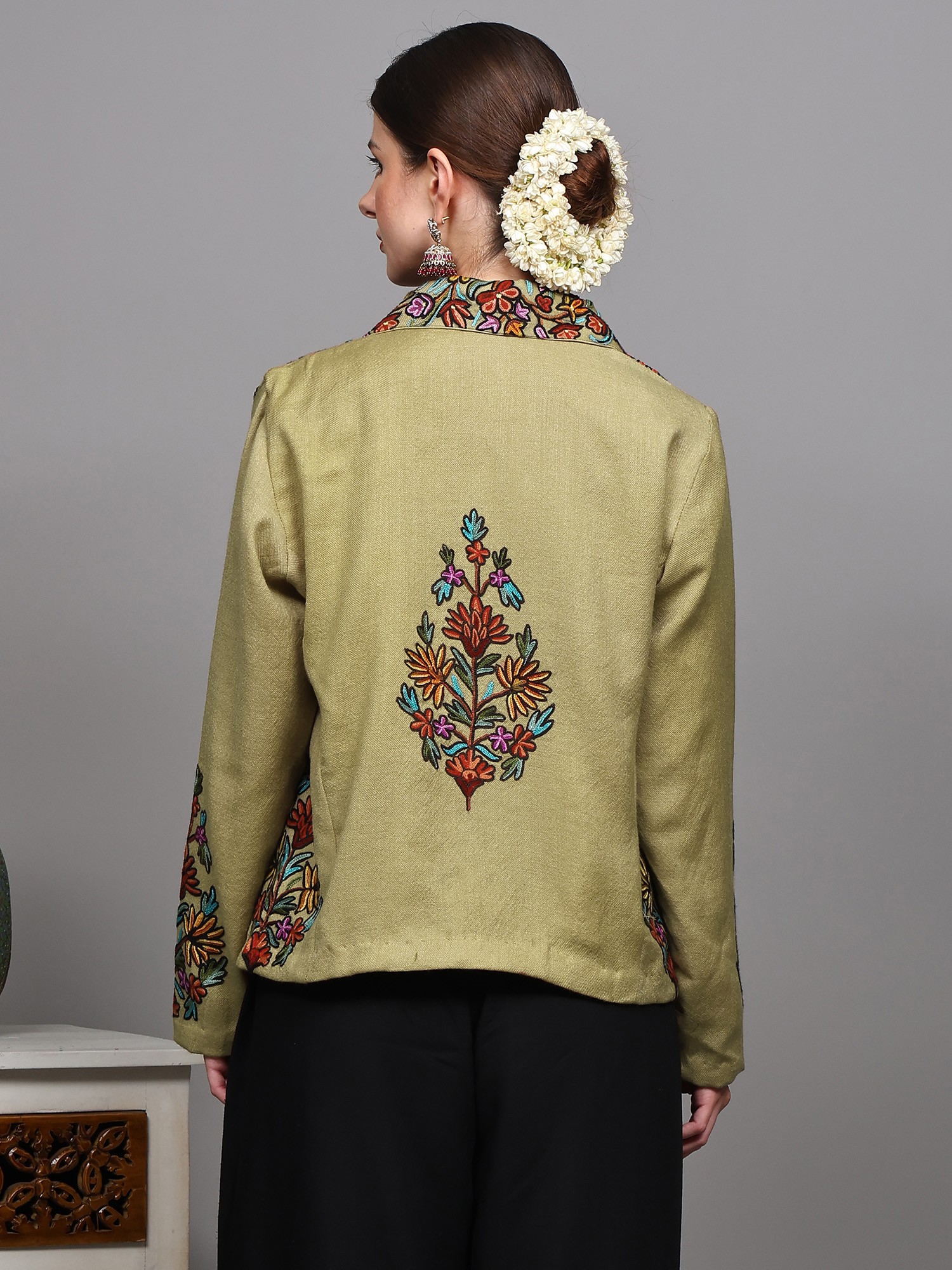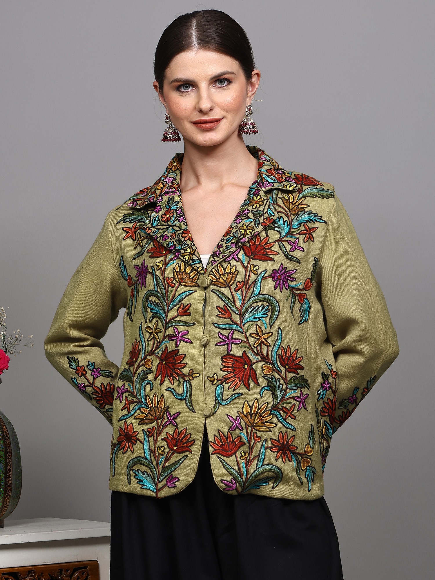 Alpine-Green Wool Short Jacket with Aari Embroidered Floral Vines and Side Pockets from Kashmir