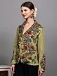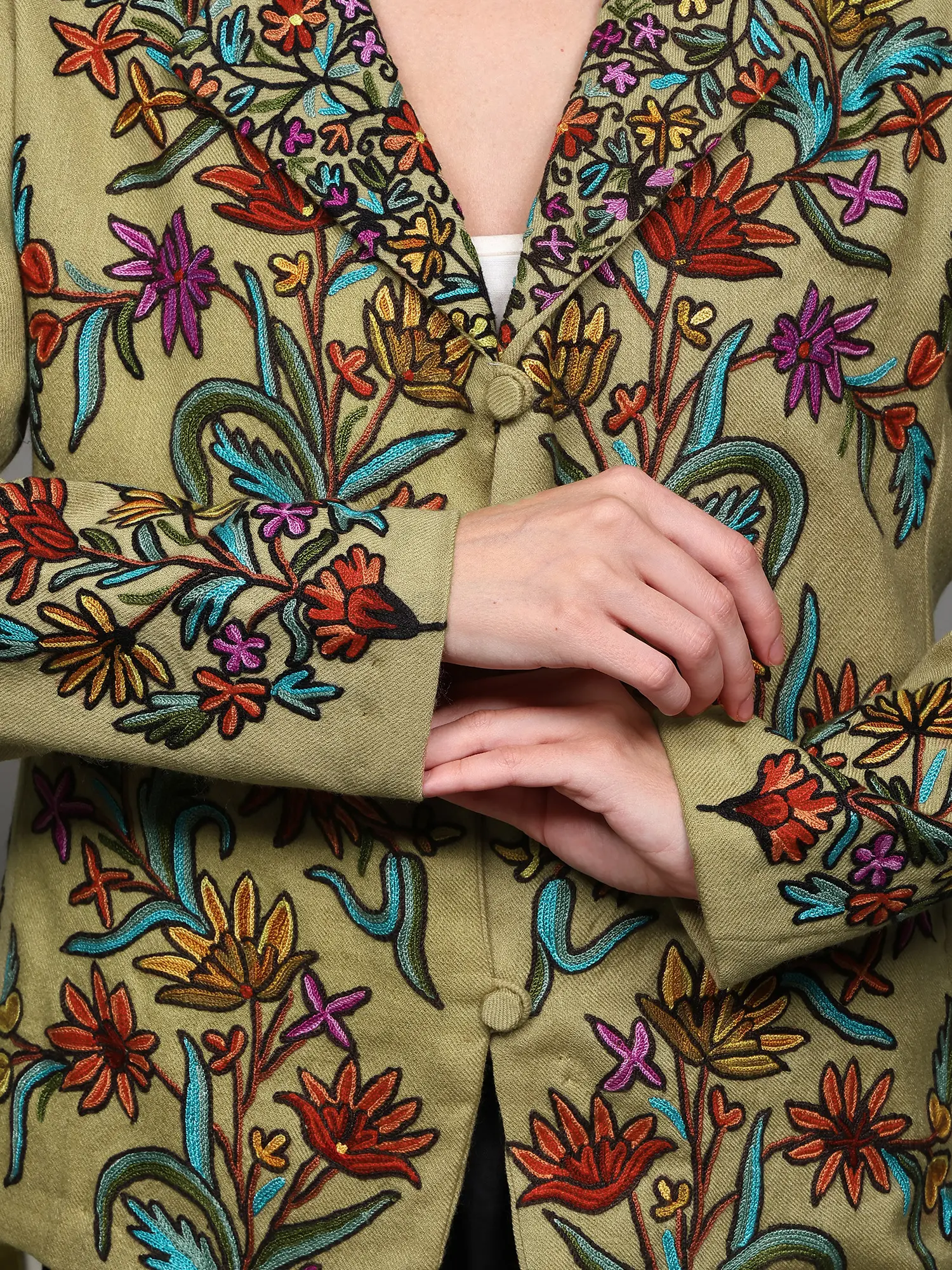 Crafted from pure wool, this jacket offers unparalleled warmth and a soft, luxurious feel against the skin. The subtle texture of the wool provides a refined backdrop for the intricate embroidery, ensuring the design remains the focal point. Its short silhouette offers a contemporary twist on classic outerwear, making it versatile enough to dress up or down. The classic lapel design adds a touch of sophistication, while the expertly tailored fit ensures a flattering drape. The gentle olive green hue of the wool serves as the perfect canvas for the explosion of colorful blooms.