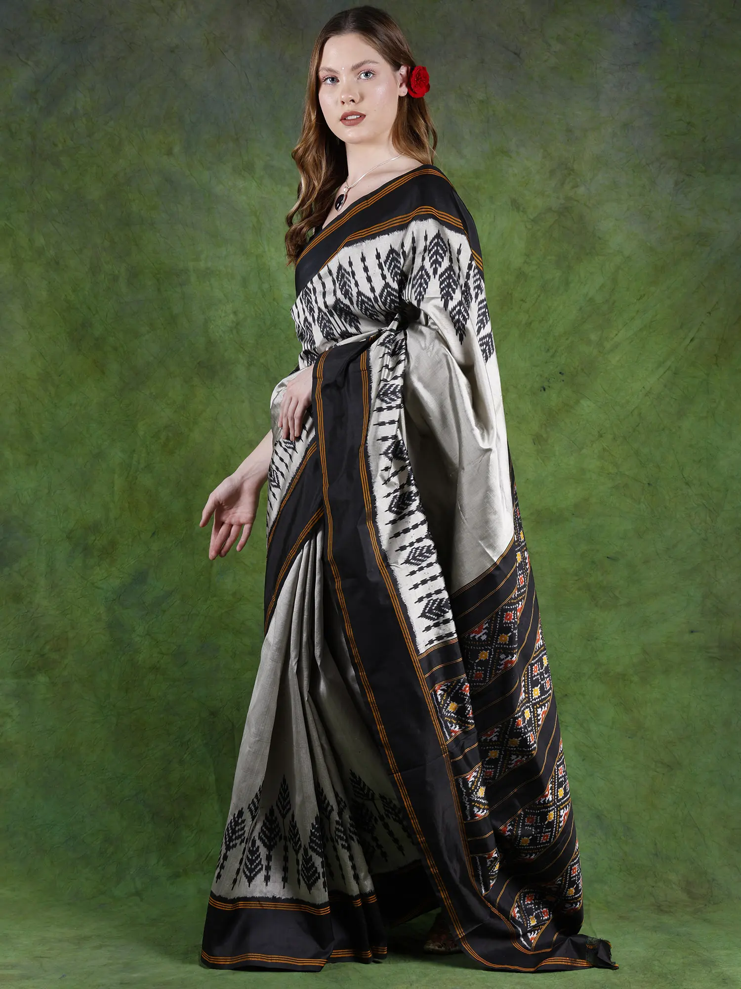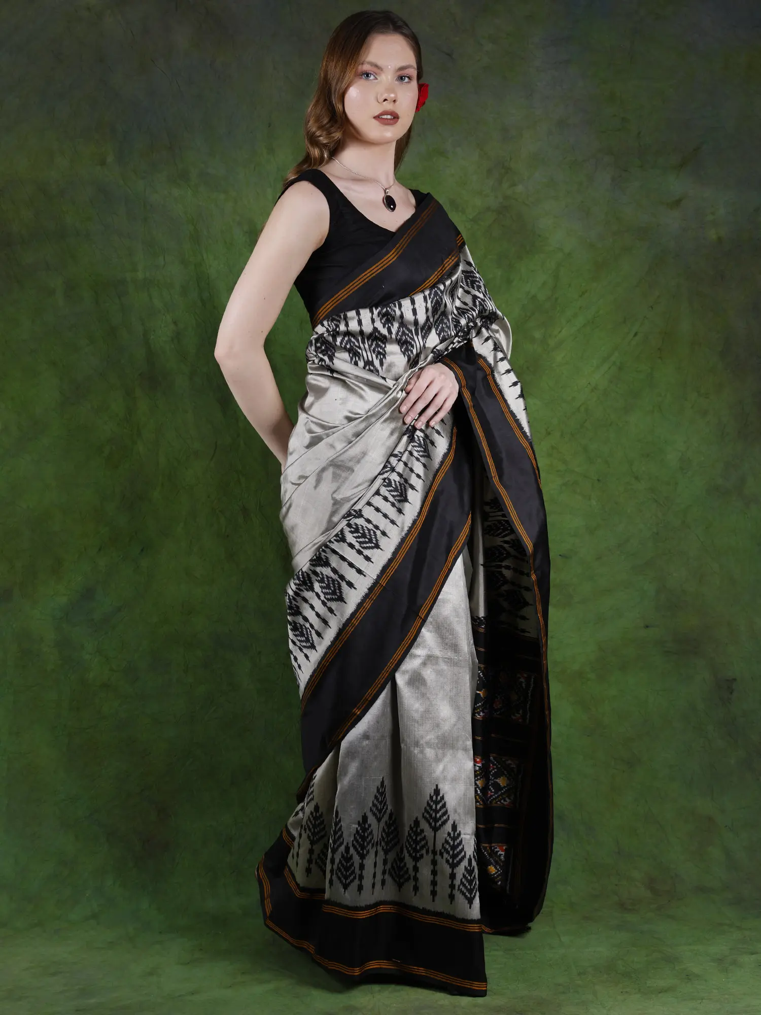 The elegance of the silver-grey body is amplified by a commanding black border, creating a visual anchor that is both classic and bold. This deep, rich black is adorned with delicate golden-yellow stripes that add a touch of understated opulence. Further enriching the border is the characteristic Pochampally Ikat pattern, featuring a mesmerizing interplay of black and vibrant multicoloured geometric shapes. This intricate detailing on the border draws the eye, showcasing the complexity and precision of the weaving technique, while the contrasting colours ensure a striking and memorable silhouette.
