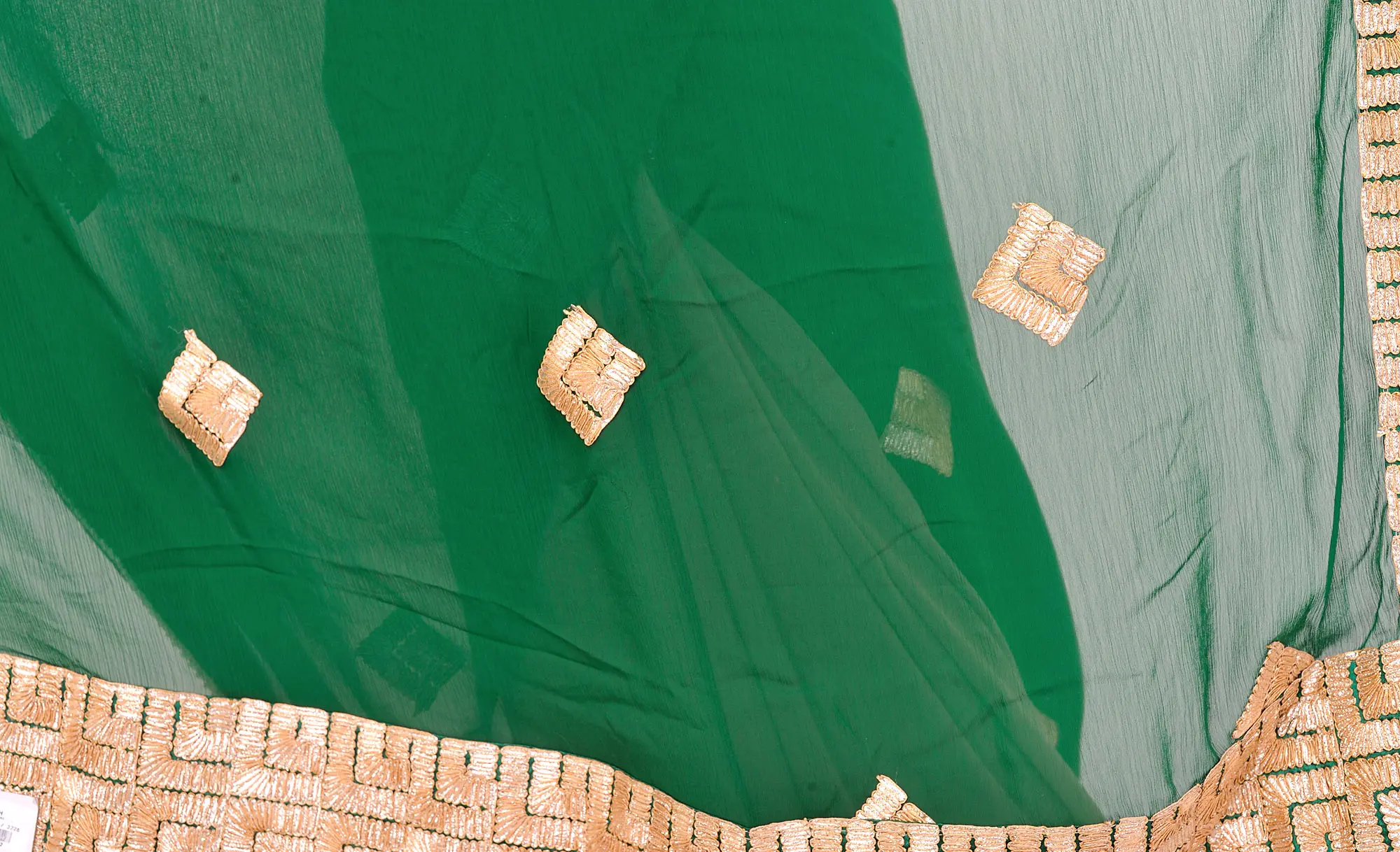Elegance takes center stage in our Silver-Sage and Green Shaded Wedding Saree. The blend of festive silver-sage and green hues sets a refined tone. A golden patch border adorned with faux pearls adds a touch of opulence. The sari's charm lies in its intricate embroidery, a testament to fashion-forward minimalism. This drape is a celebration of subtle yet striking aesthetics, a perfect choice for those who appreciate the interplay of tradition and contemporary style. Let the hues and embroidery weave a story of sophistication as you grace any occasion with your impeccable fashion sense.