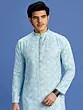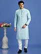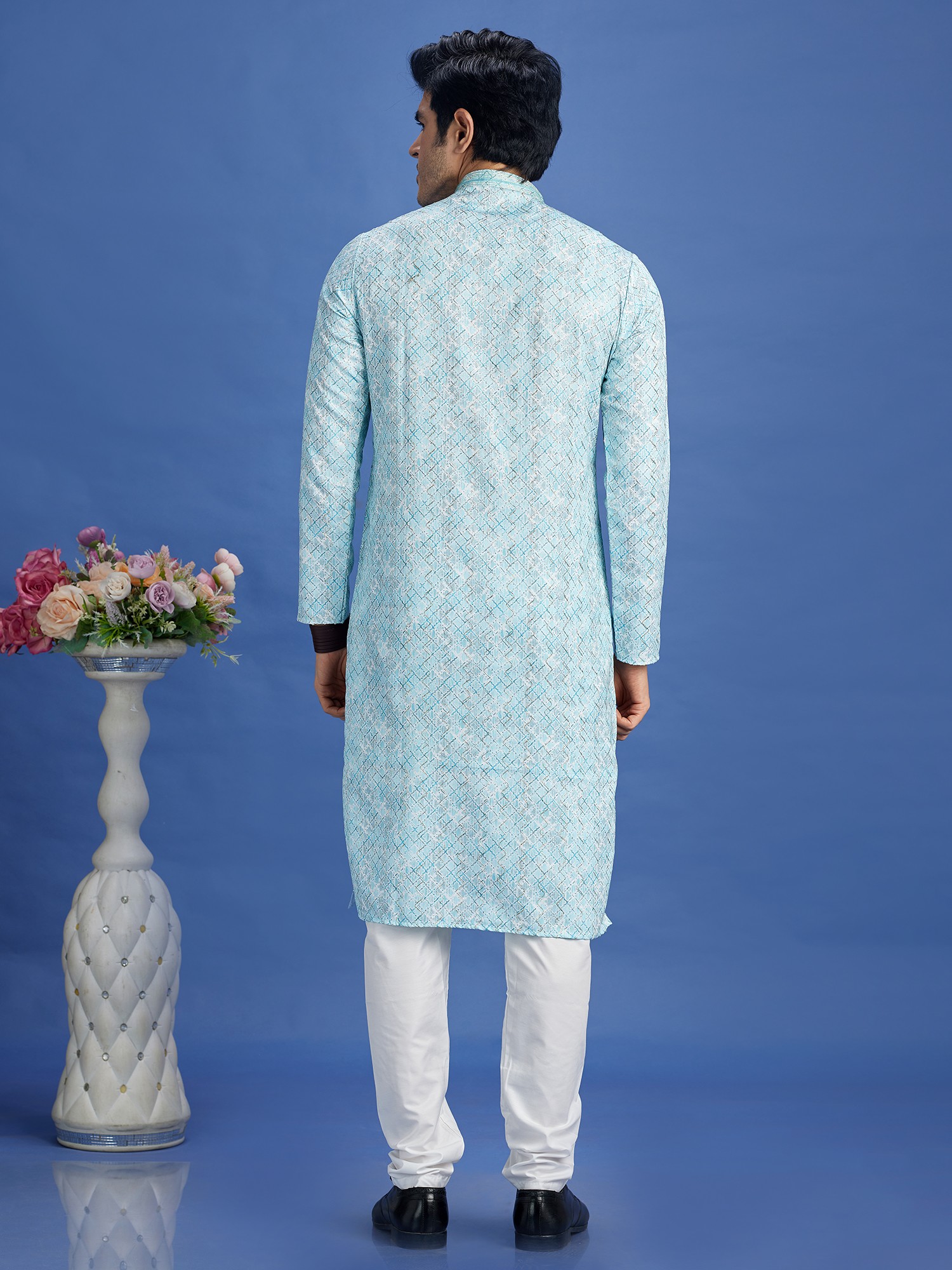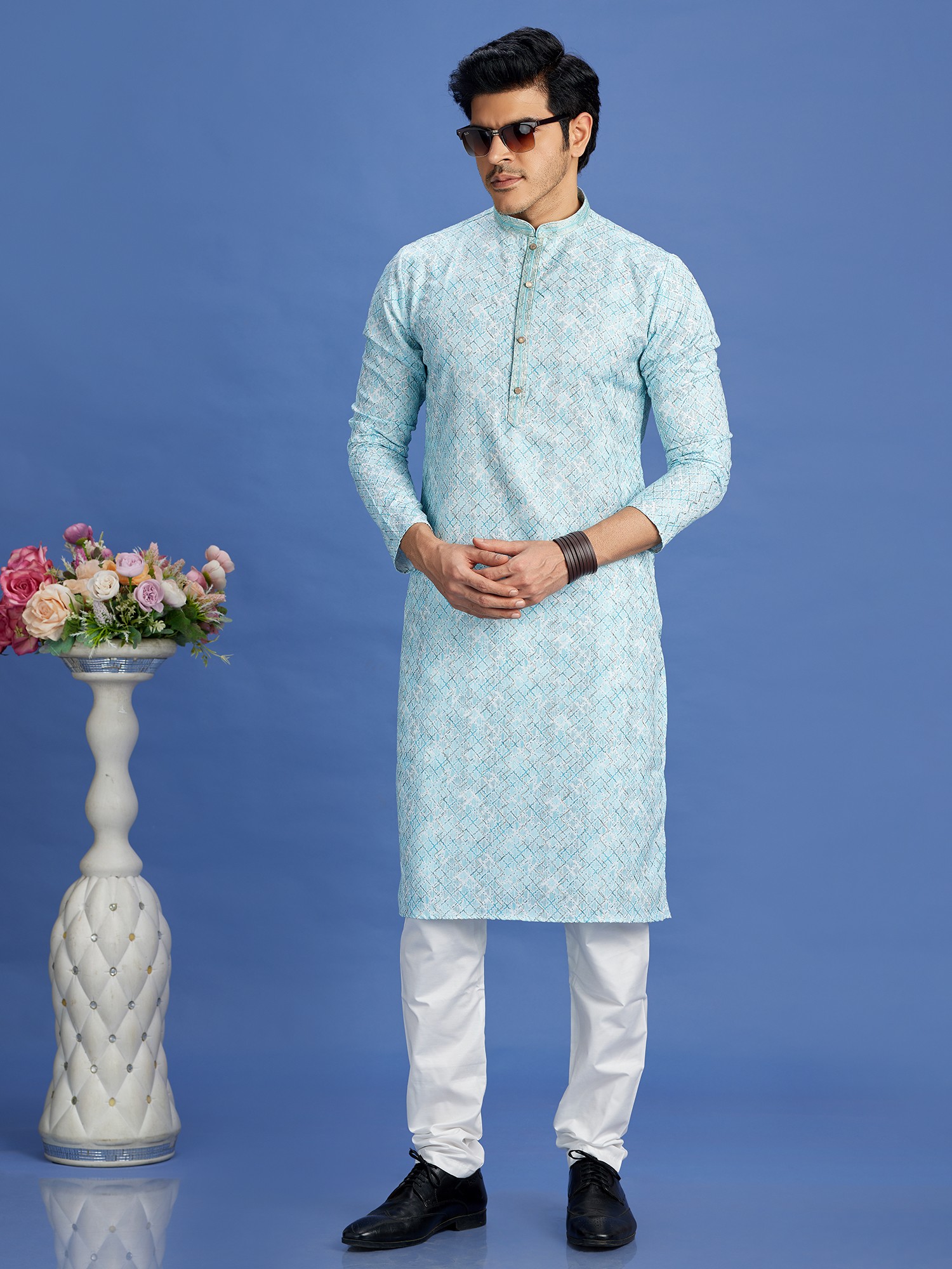 Sky Blue Embroidery Work Festive Wear Straight Kurta Pajama Set with Digital Print and Cotton Mandarin Collar