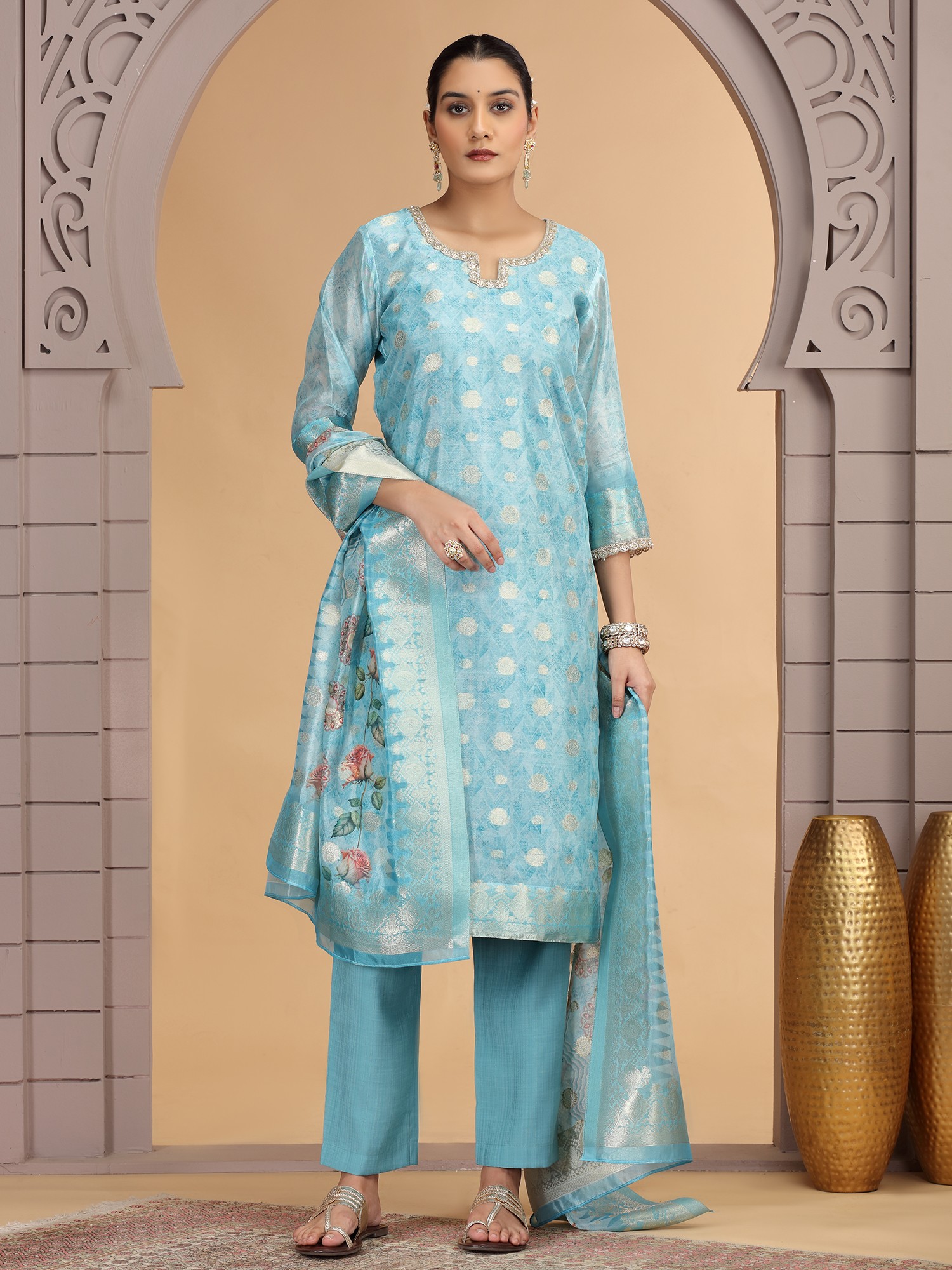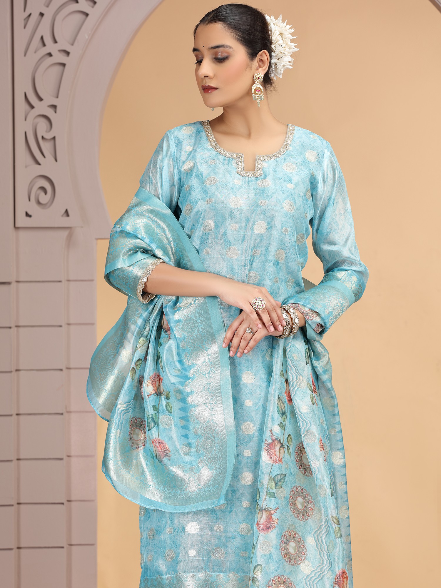 Grey Floral Motifs Organza Jacquard Party Wear Salwar Suit with Dupatta and Pattern Work