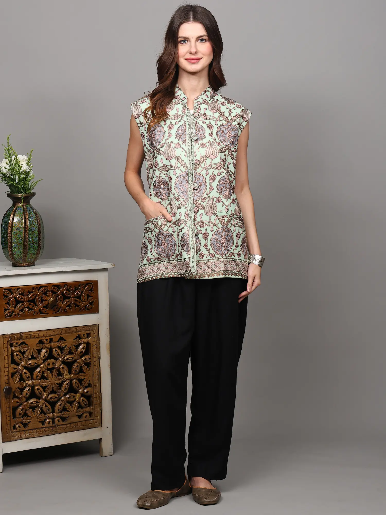 Elevate your wardrobe with this exquisite sleeveless jacket, a true testament to artisanal craftsmanship. Crafted from pure wool, it offers a luxurious feel and a graceful drape, perfect for adding a layer of sophisticated charm to any ensemble. The jacket is adorned with a captivating multicolor floral pattern, brought to life through intricate chain stitch thread embroidery. Each bloom and petal is meticulously rendered, creating a vibrant and eye-catching design that speaks of timeless elegance.