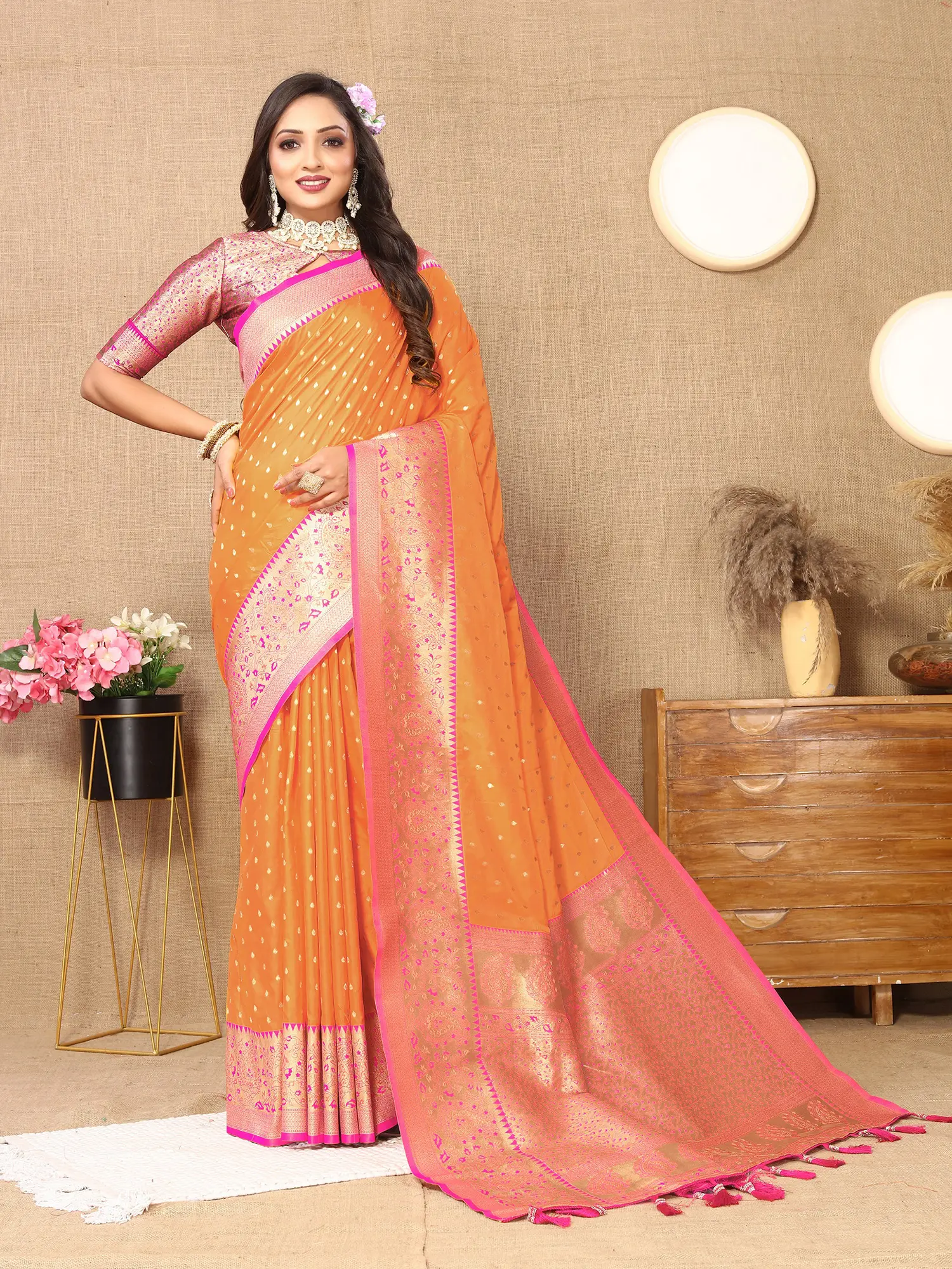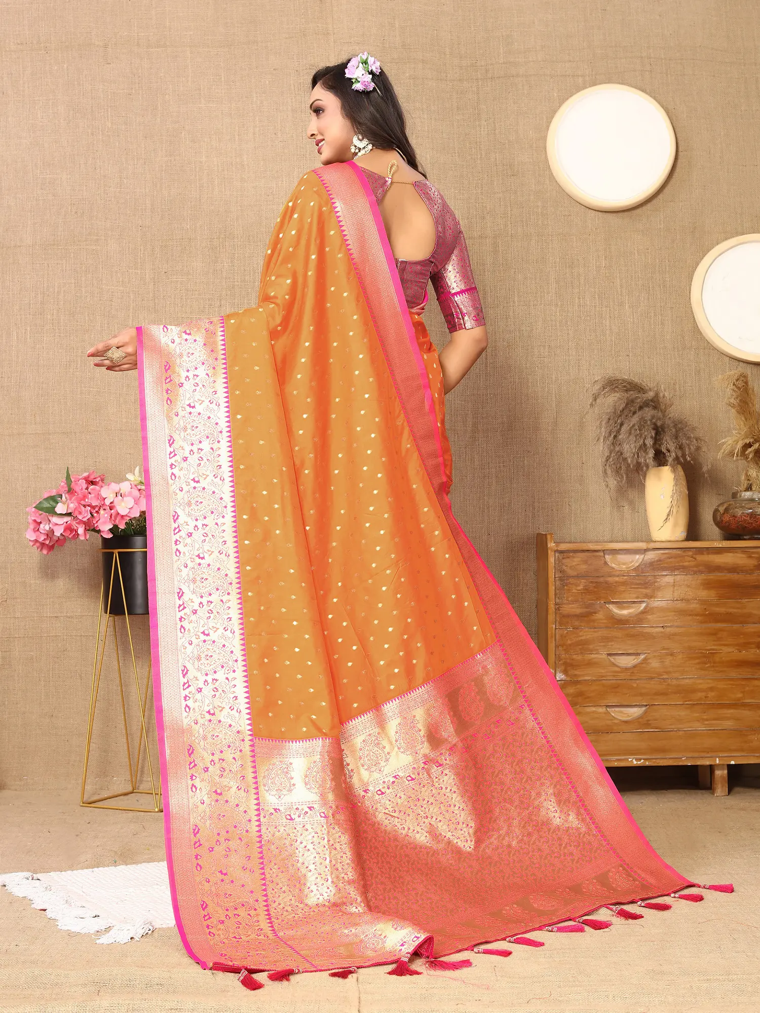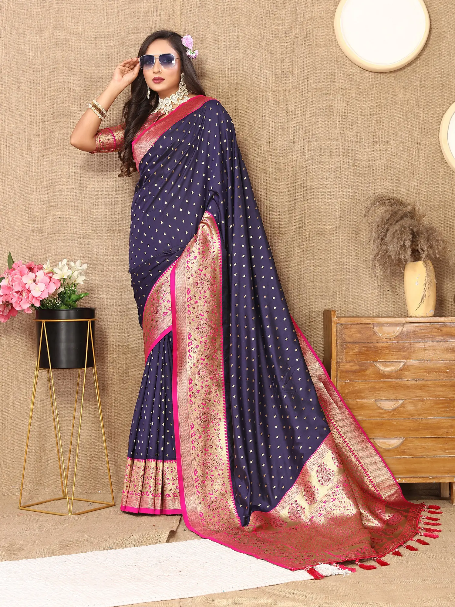 Turquoise Art Silk Saree from Assam with Golden Zari Woven Motif and Tassles on The Pallu