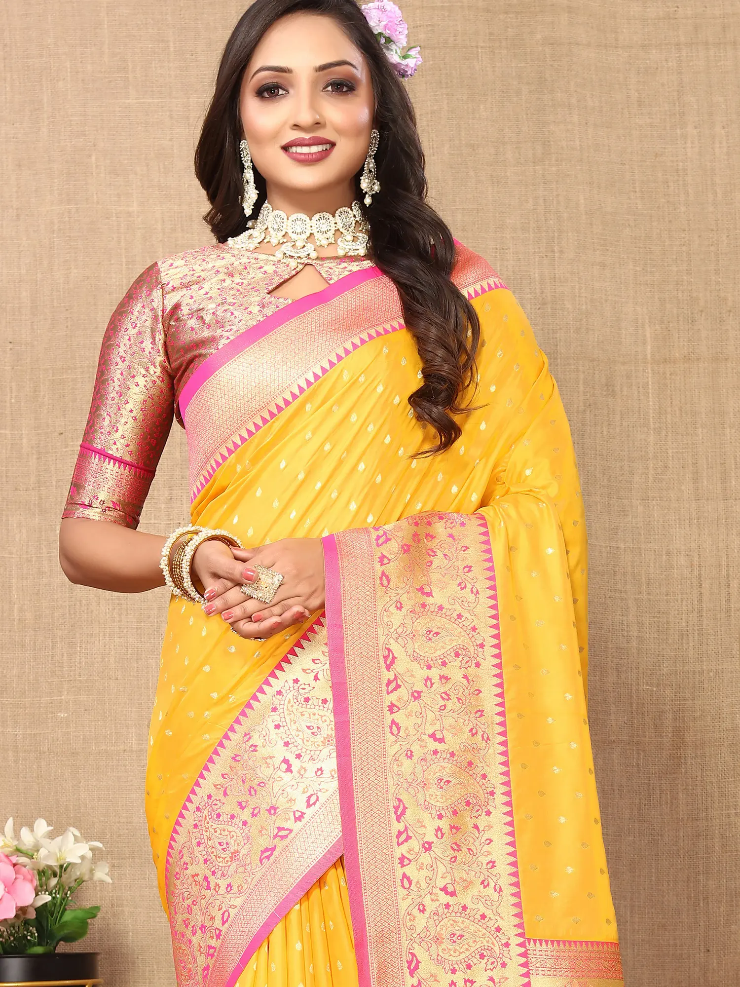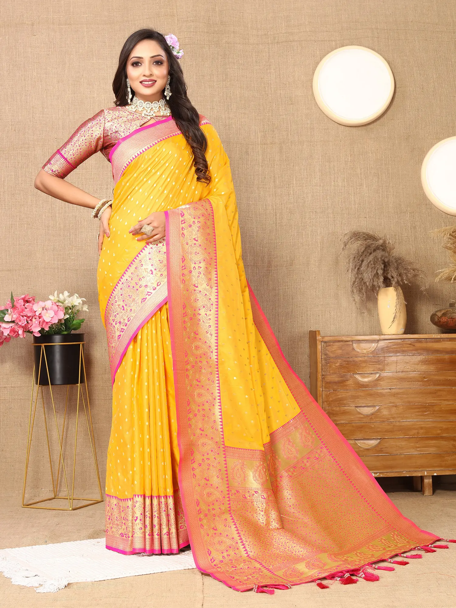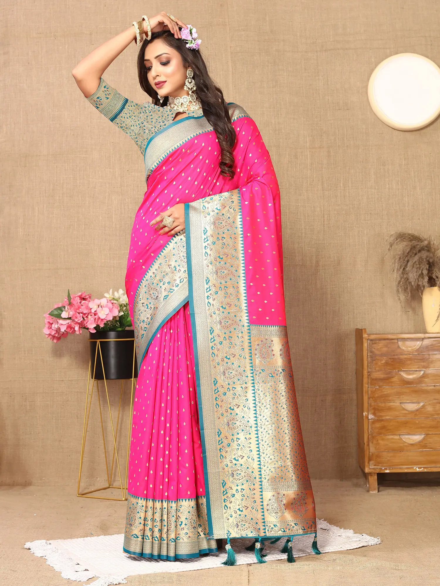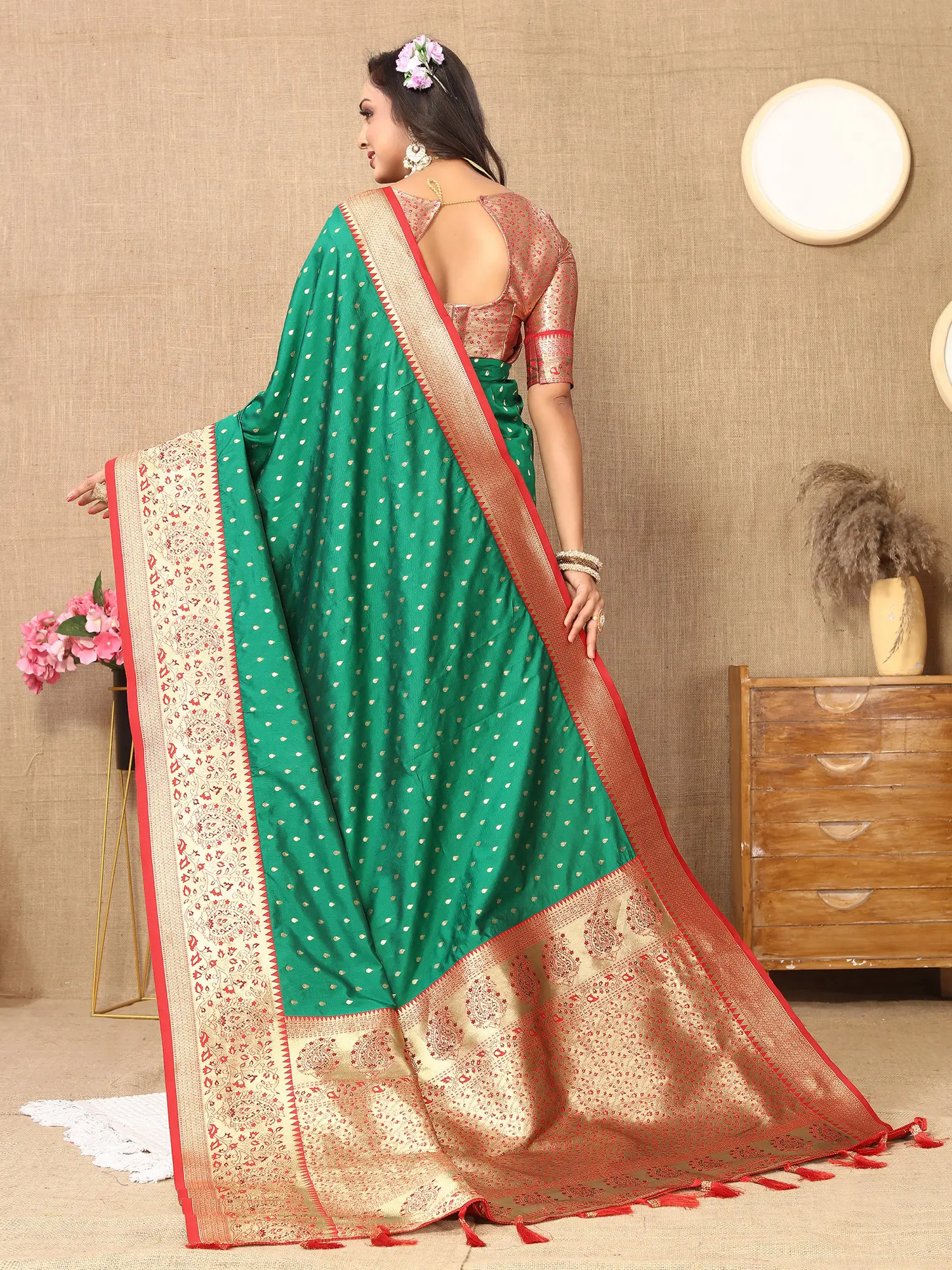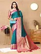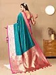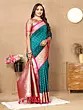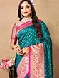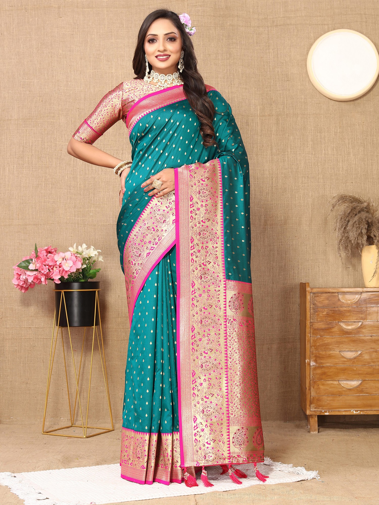 Turquoise Art Silk Saree from Assam with Golden Zari Woven Motif and Tassles on The Pallu