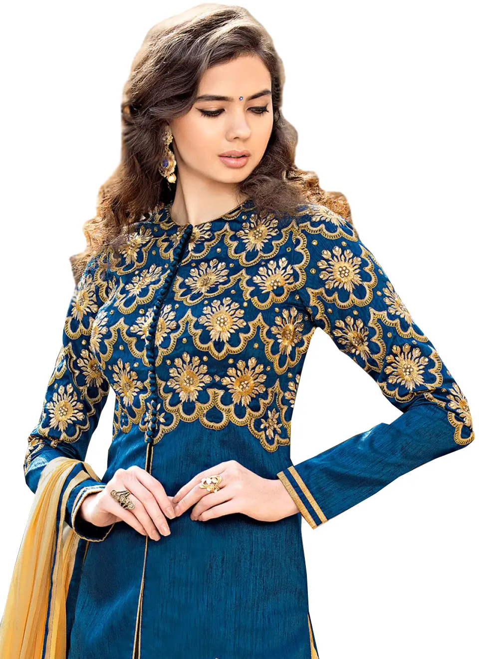 Embrace timeless elegance with this stunning designer lehenga suit, a masterpiece crafted from luxurious art silk. The rich, snorkel-blue hue of the kameez serves as a captivating canvas for intricate golden floral embroidery, meticulously detailed with fine zari thread and sparkling crystals. This exquisite embellishment cascades across the bodice, sleeves, and hemline, creating a mesmerizing visual appeal that is both opulent and sophisticated. The high neckline and full-length sleeves of the kameez exude a regal charm, while the modern cut and front slit offer a contemporary flair, allowing for graceful movement. ––––––––––––––––––––