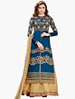The lehenga itself is a vision of understated luxury, fashioned from a shimmering golden art silk fabric. Its surface is subtly patterned with a delicate, tone-on-tone floral motif, ensuring it complements rather than competes with the intricately embroidered kameez. The border of the lehenga mirrors the rich detailing of the kameez, featuring golden stripes and a refined fabric trim. Completing this magnificent set is a flowing golden dupatta. Draped elegantly over the shoulders, it adds a final touch of grace and sophistication to the overall look. The dupatta is bordered with a thin strip of the snorkel-blue fabric, subtly tying the entire ensemble together. This lehenga suit is an ideal choice for weddings, festive celebrations, or any occasion where you wish to make a memorable statement of refined style and traditional elegance.