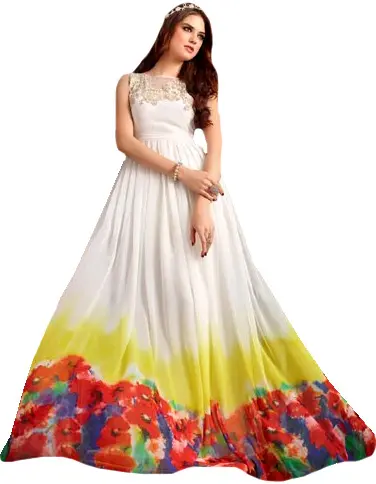 The fine georgette fabric used by the designer of this white floral printed gown has allowed them to give a luxurious flowing feel to the A-line attire.