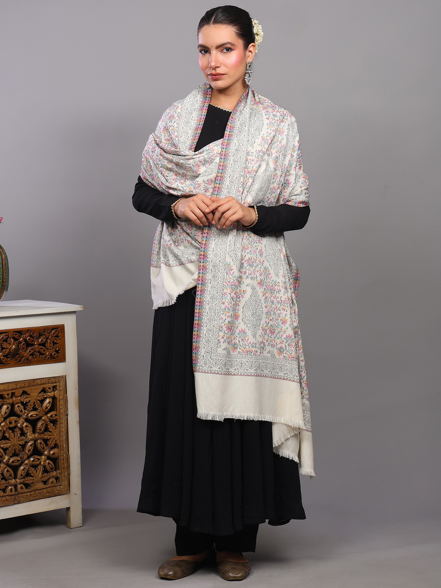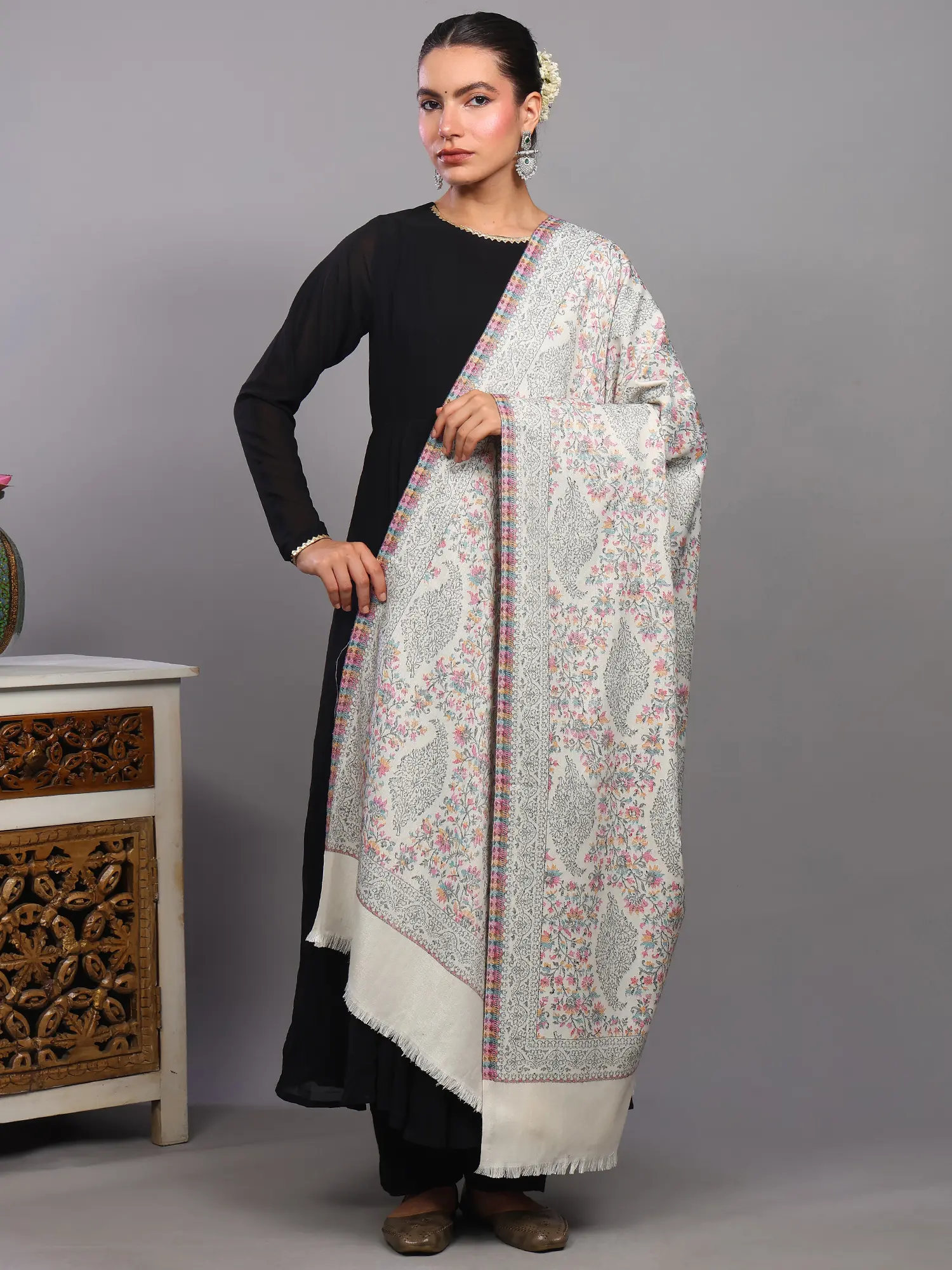 Pure Wool Kani Jamawar Shawl from Amritsar with Embroidered Flowers and Paisleys