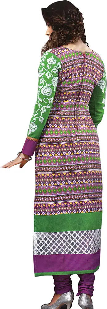 Long Printed Salwar Kameez with Crewel Embroidered Flowers on Neck and Faux Pearls