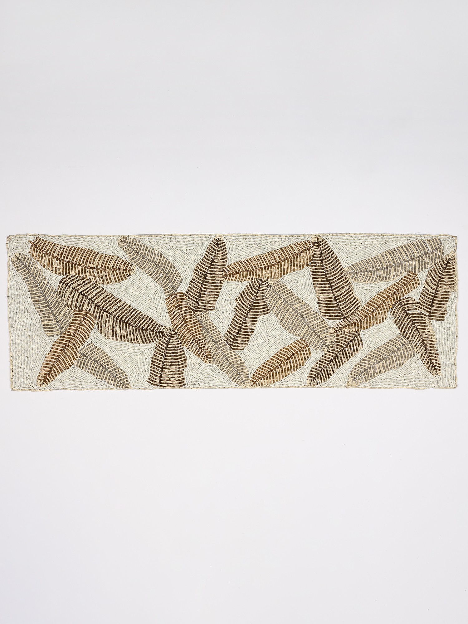 Snow-White Rectangle Shaped Table Runner with Bead Embroidered Leaves