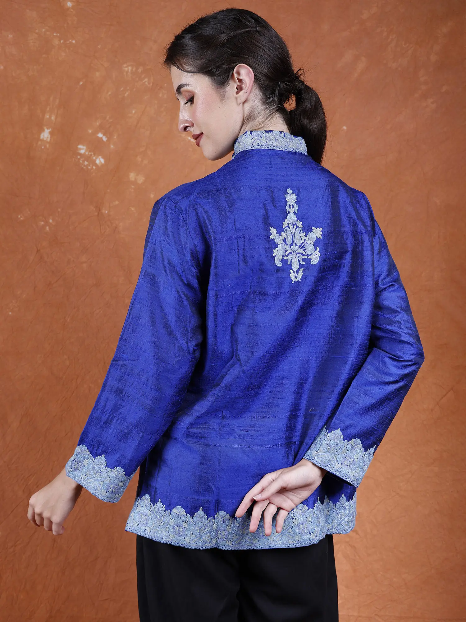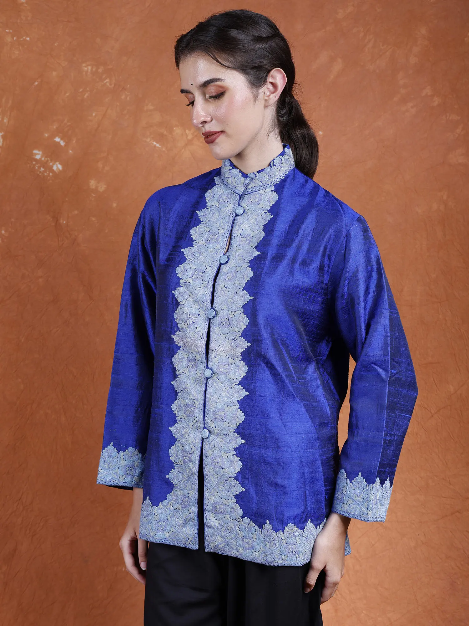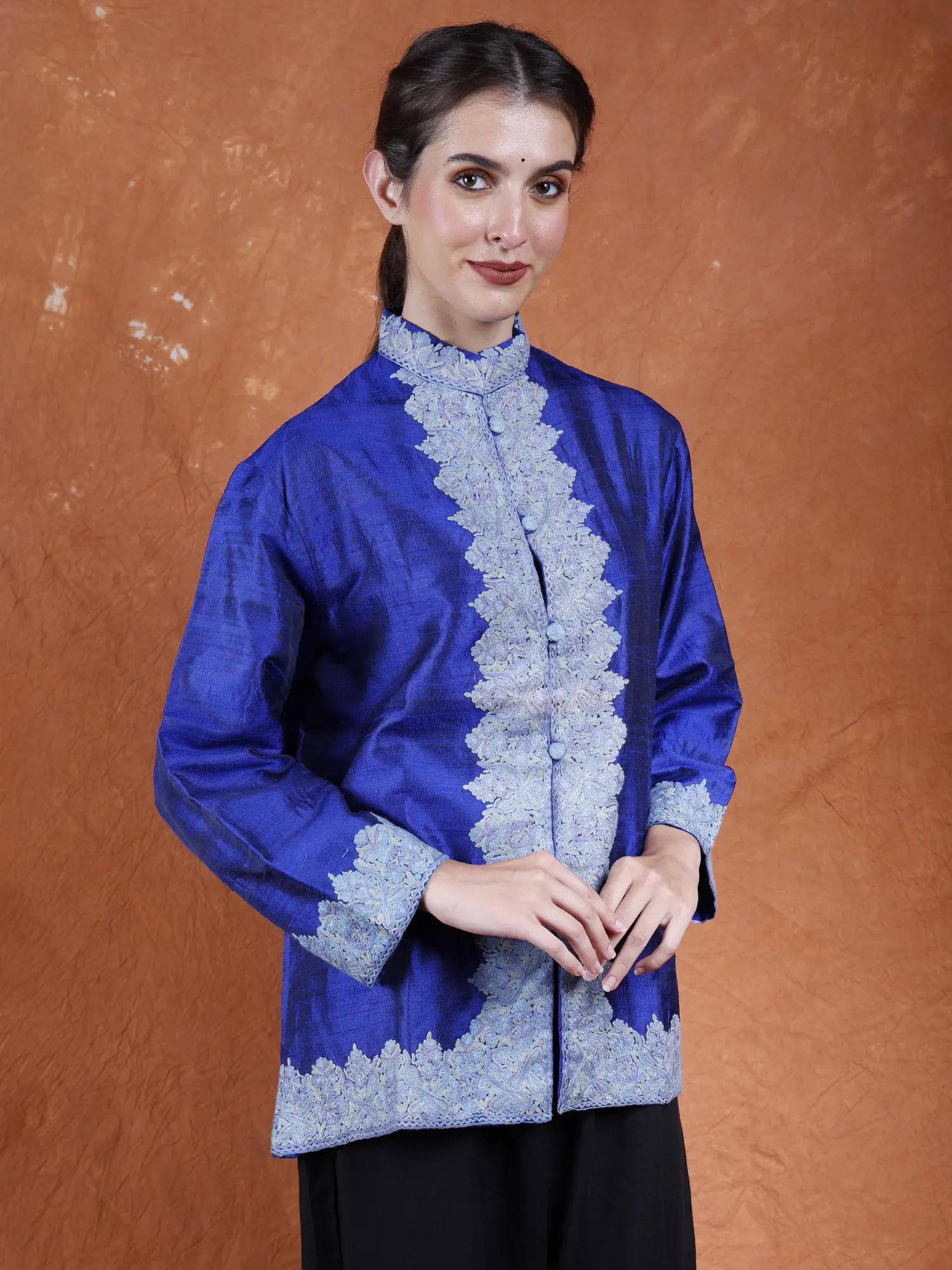 The light blue Ari work intricately adorning the cypress flower motif on the neck and button line of this Sodalite-Blue Matka-Silk Plain Short Jacket from Kashmir exudes timeless elegance and sophistication. Perfect for evening functions, this jacket offers versatility as it can be effortlessly paired with skirts or trousers, creating an effortlessly chic indo-western look.