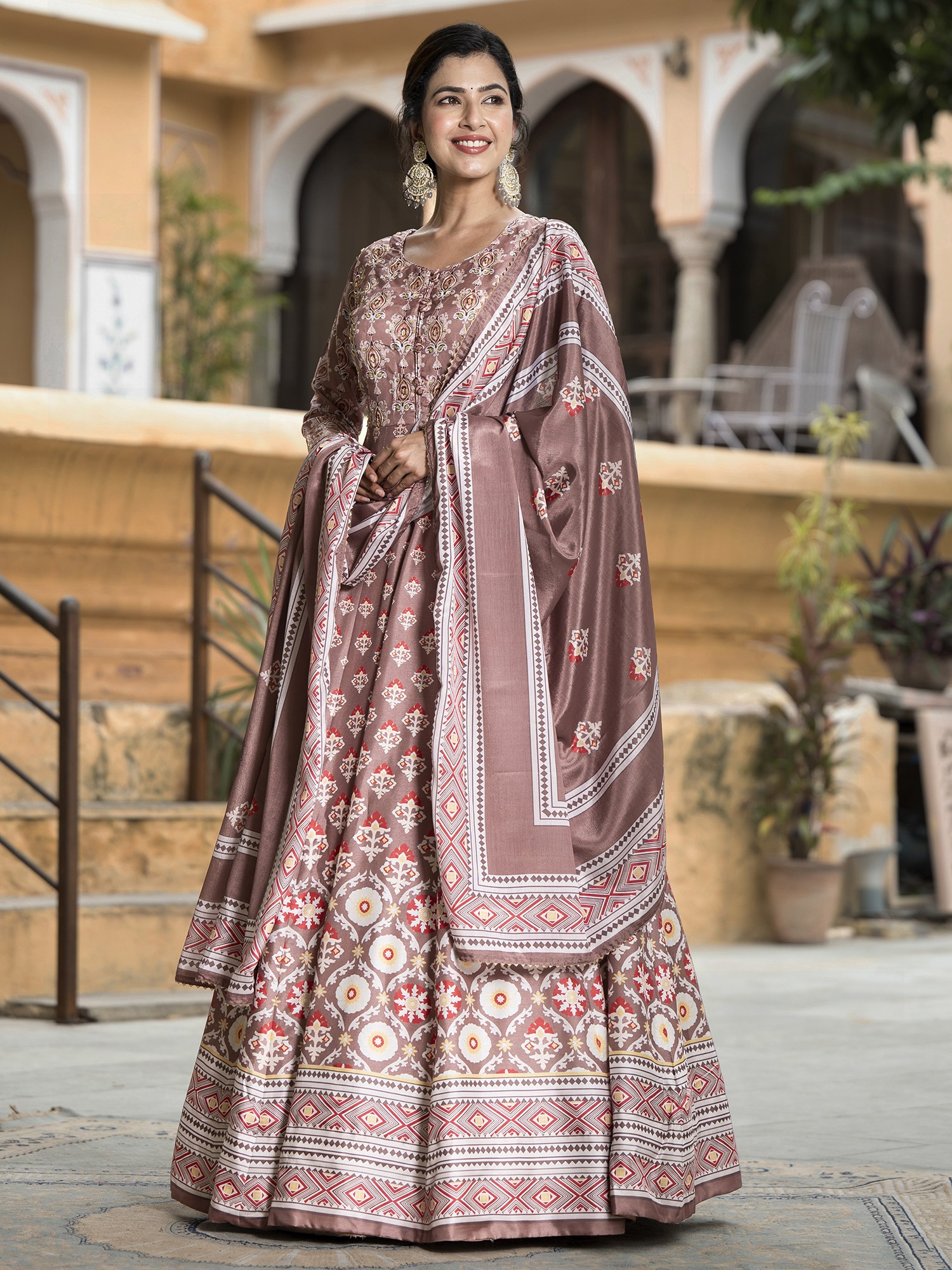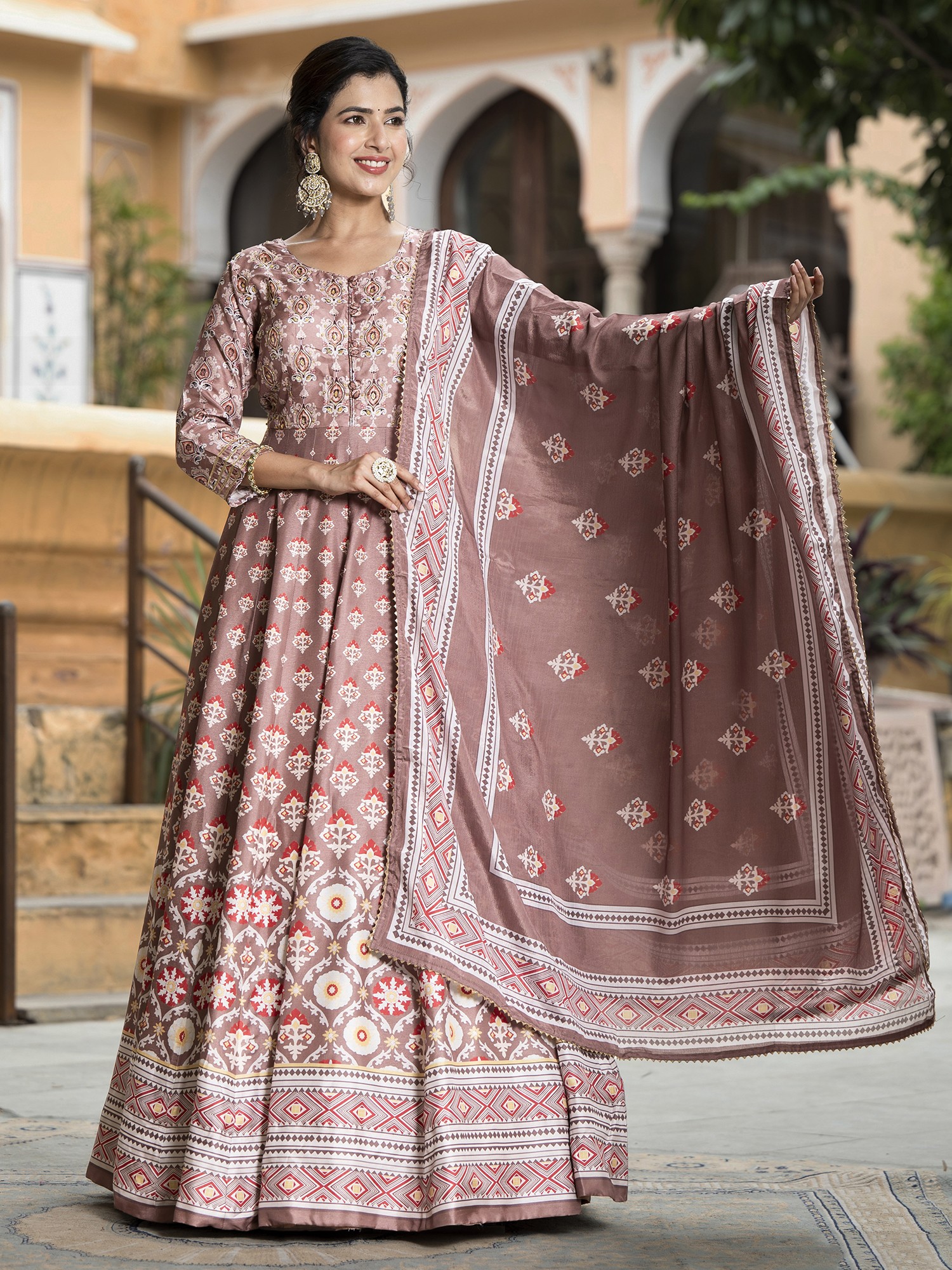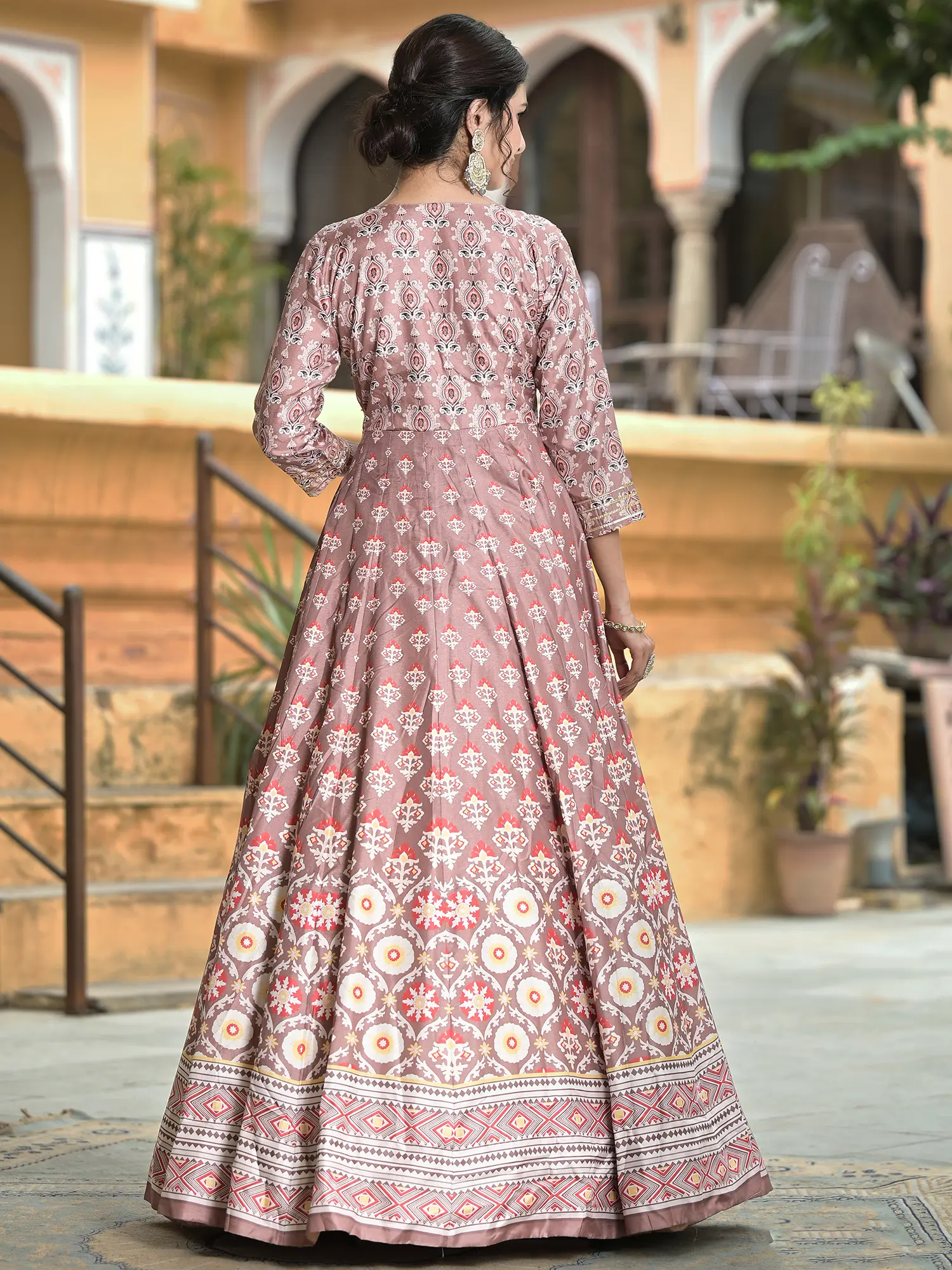 This Anarkali gown is an ideal choice for weddings, receptions, and other festive gatherings. Its versatile design allows for various styling options. Pair it with statement jewelry and heels for a glamorous look, or opt for delicate accessories for a more understated elegance. The beautiful cut and print make this dress a true showstopper.