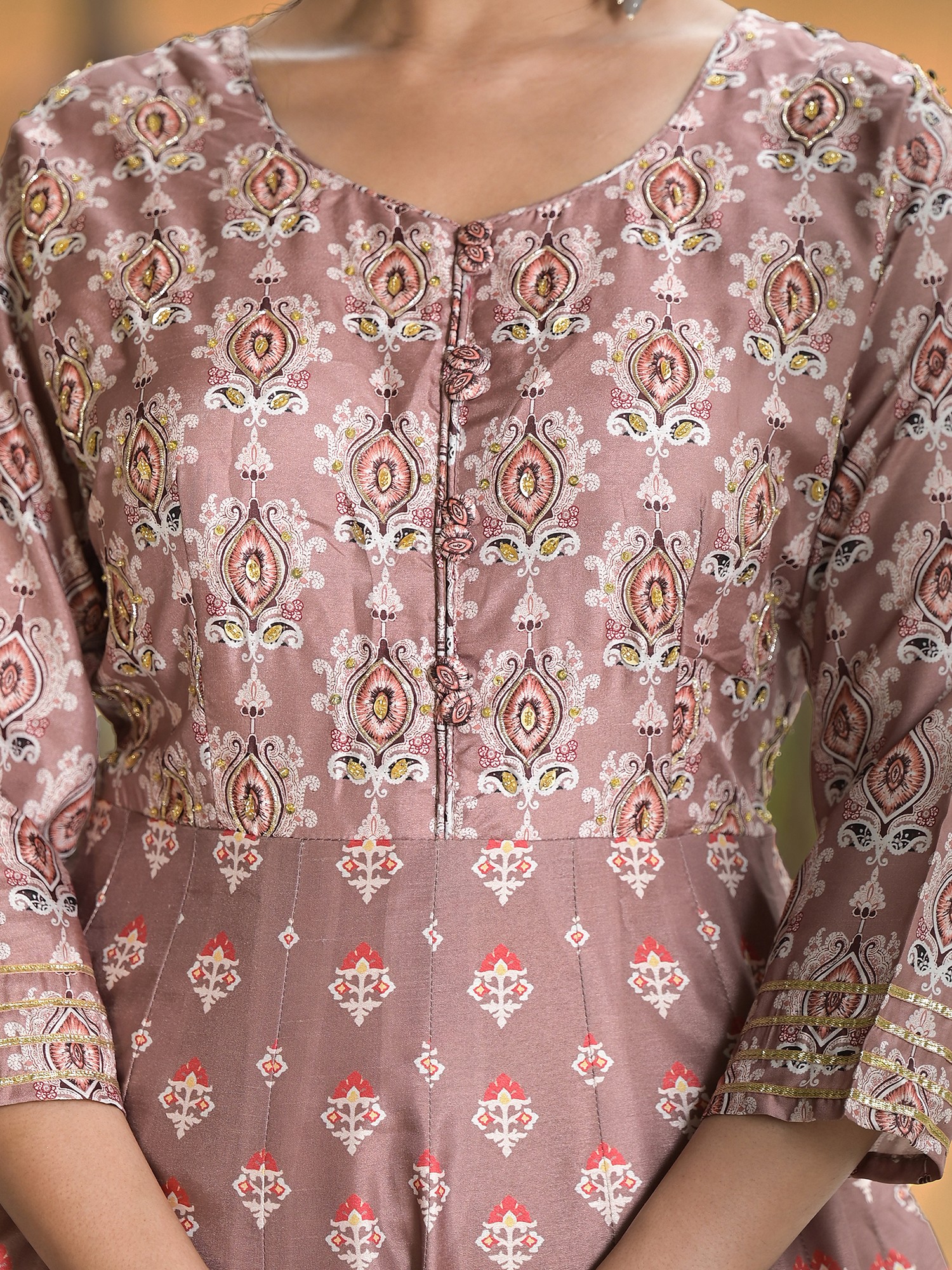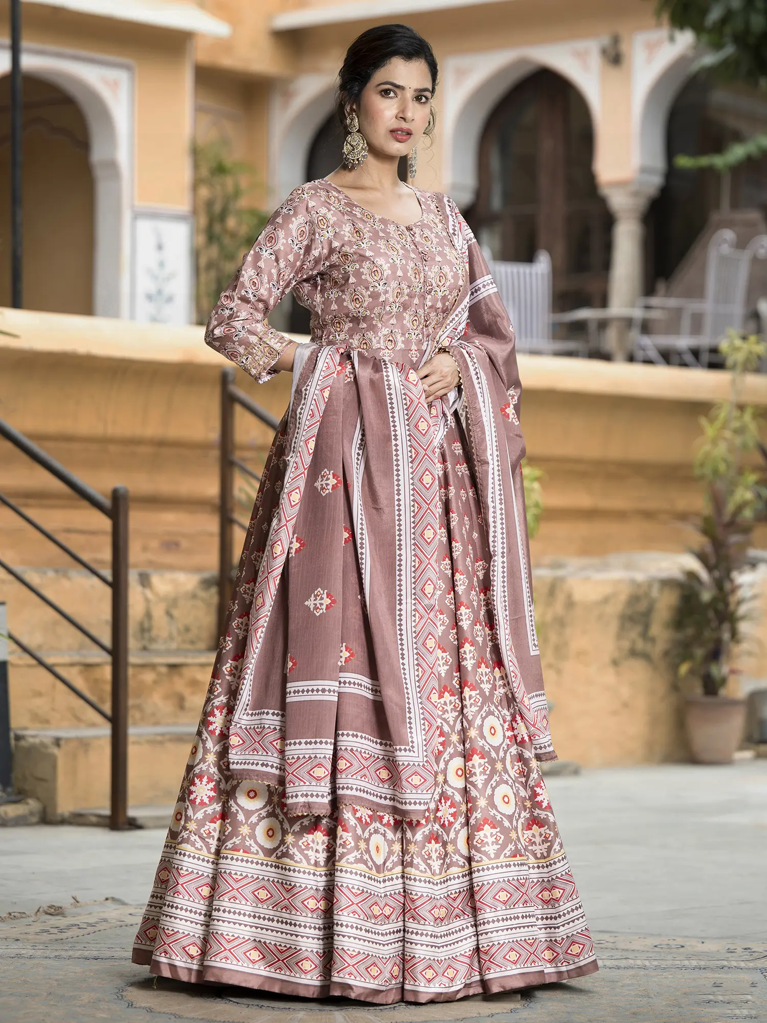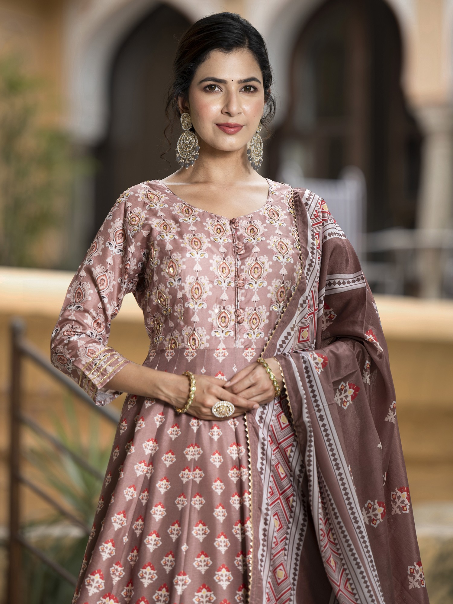 This Anarkali gown is an ideal choice for weddings, receptions, and other festive gatherings. Its versatile design allows for various styling options. Pair it with statement jewelry and heels for a glamorous look, or opt for delicate accessories for a more understated elegance. The beautiful cut and print make this dress a true showstopper.