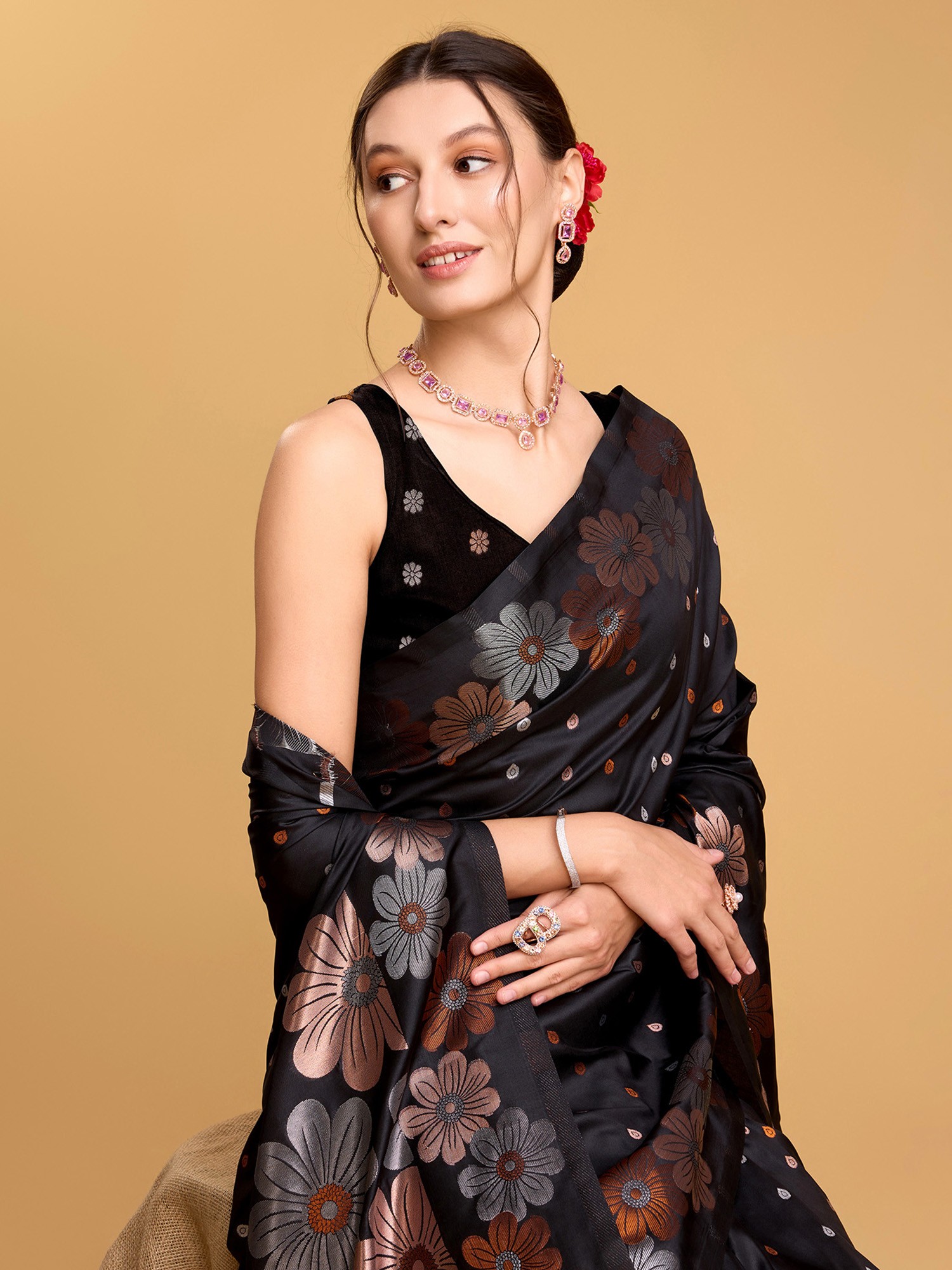 Unveil a world of refined beauty with this stunning black saree, crafted from the finest soft Lichi silk. The rich, deep black canvas serves as the perfect backdrop for a vibrant cascade of floral motifs that bloom with captivating charm. Each flower is meticulously designed, showcasing a symphony of colors – warm oranges, delicate peaches, cool greys, and soft pinks – all interspersed with tiny, shimmering white and orange polka dots that add a subtle sparkle. This intricate pattern, primarily gracing the border and flowing across the length of the saree, creates a breathtaking visual appeal that is both sophisticated and eye-catching. The soft Lichi silk fabric drapes effortlessly, lending a luxurious feel and graceful movement to your silhouette, making it an ideal choice for any special occasion.