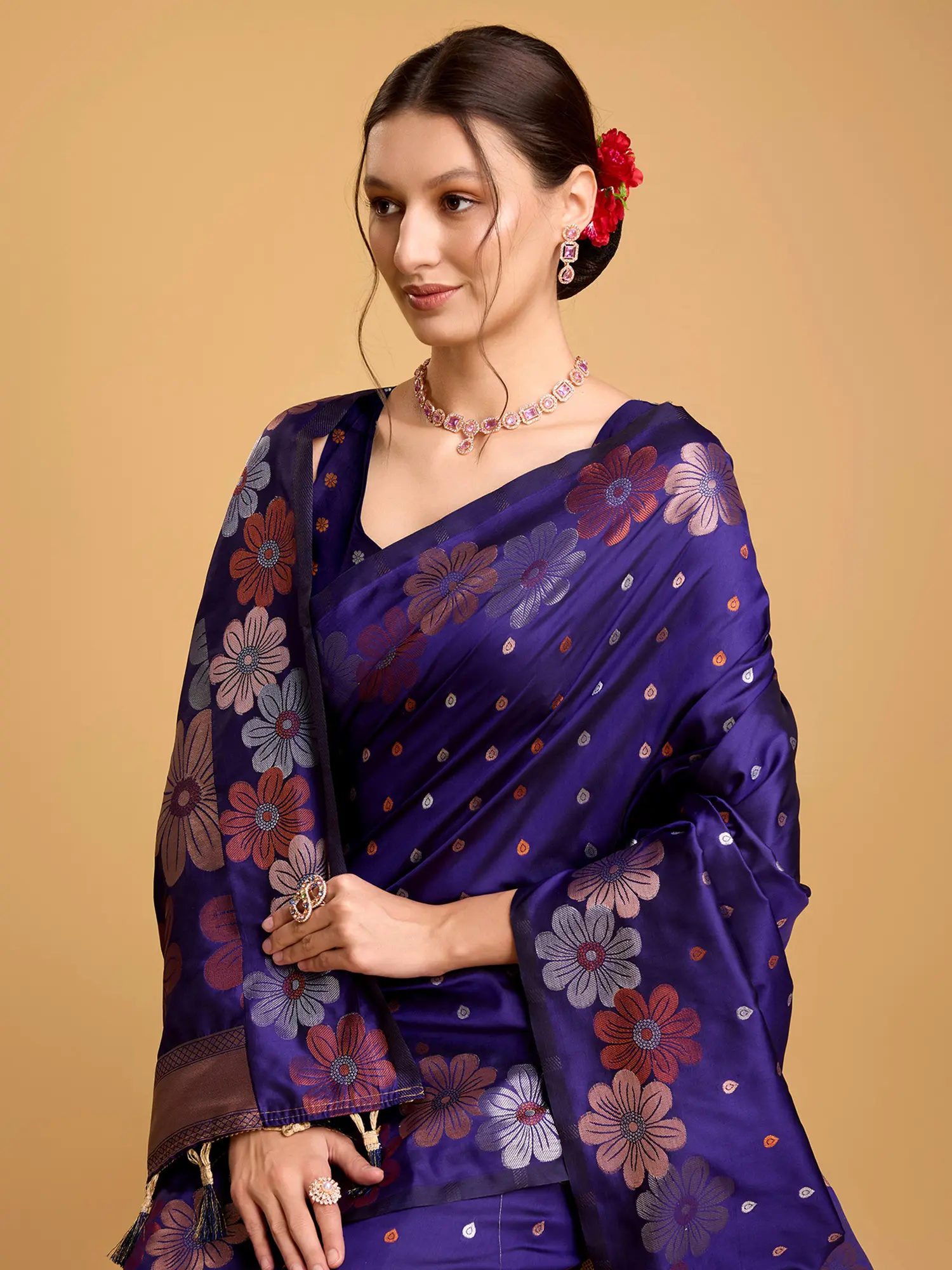 This saree is more than just an attire; it's a statement of elegance and festivity, perfectly suited for parties, weddings, and celebratory gatherings. The eye-catching floral print is a testament to timeless style, ensuring you stand out with grace and poise. The soft texture of the Lichi silk promises comfort without compromising on glamour. Imagine the gentle rustle of the silk as you move, the way the light catches the subtle sheen of the fabric, and the admiring glances drawn by the beautiful floral tapestry adorning you. It's a garment designed to make you feel confident and beautiful, embodying the spirit of celebration.