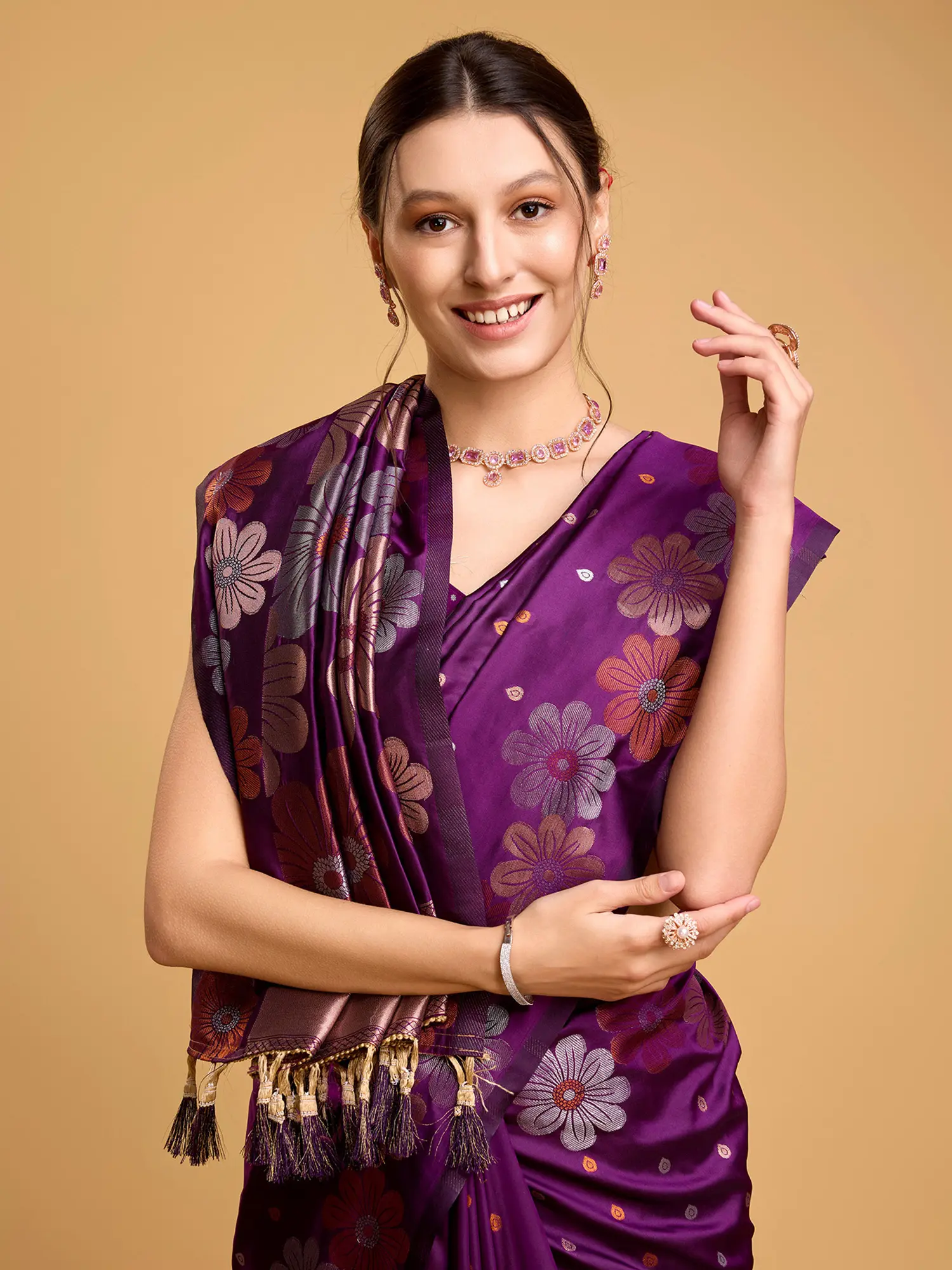 Pure Satin Silk Heavy Zircon Work Border With Foil Print Floral Designer Saree With Matching Blouse