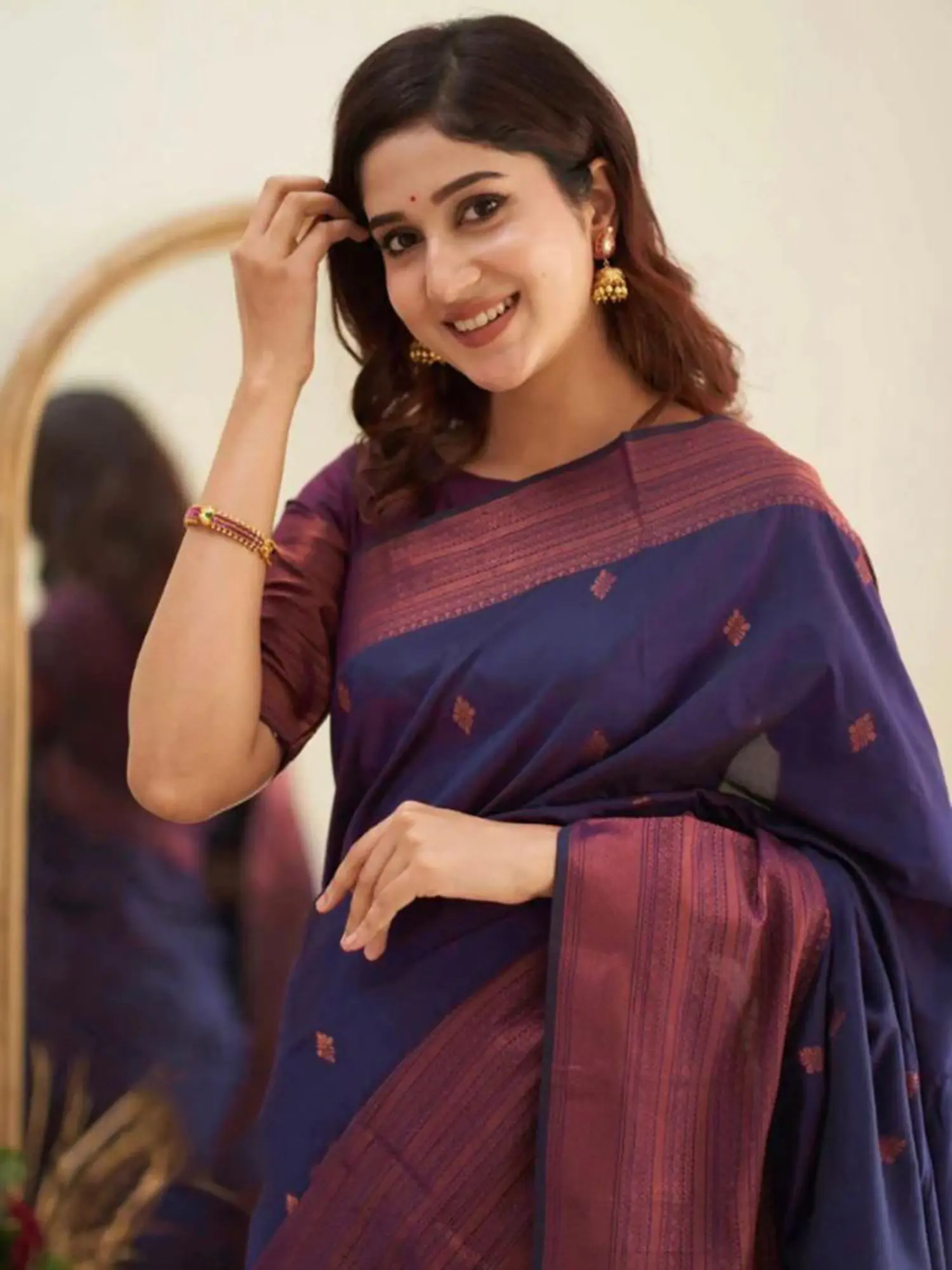 The true showstopper of this saree is its classic rich pallu. Featuring a contrasting burgundy shade with a lustrous sheen, the pallu is densely woven with elaborate patterns. This broad border of the pallu is designed to command attention, showcasing opulent zari work that sparkles with every movement. The combination of the deep indigo body and the rich, ornate pallu creates a striking visual harmony, making this saree a perfect choice for any grand occasion.