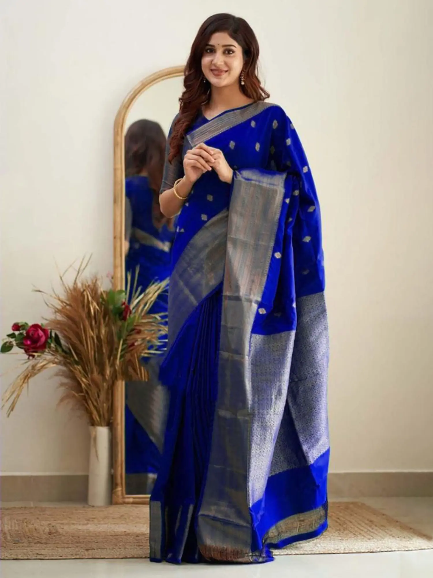 Immerse yourself in the luxurious embrace of this exquisite silk saree, a masterpiece designed to elevate your festive and wedding wardrobe. Crafted from the finest lichi silk, it offers a soft, fluid drape that moves with grace and sophistication. The rich, deep indigo hue serves as a stunning canvas for the intricate details that make this saree truly special.