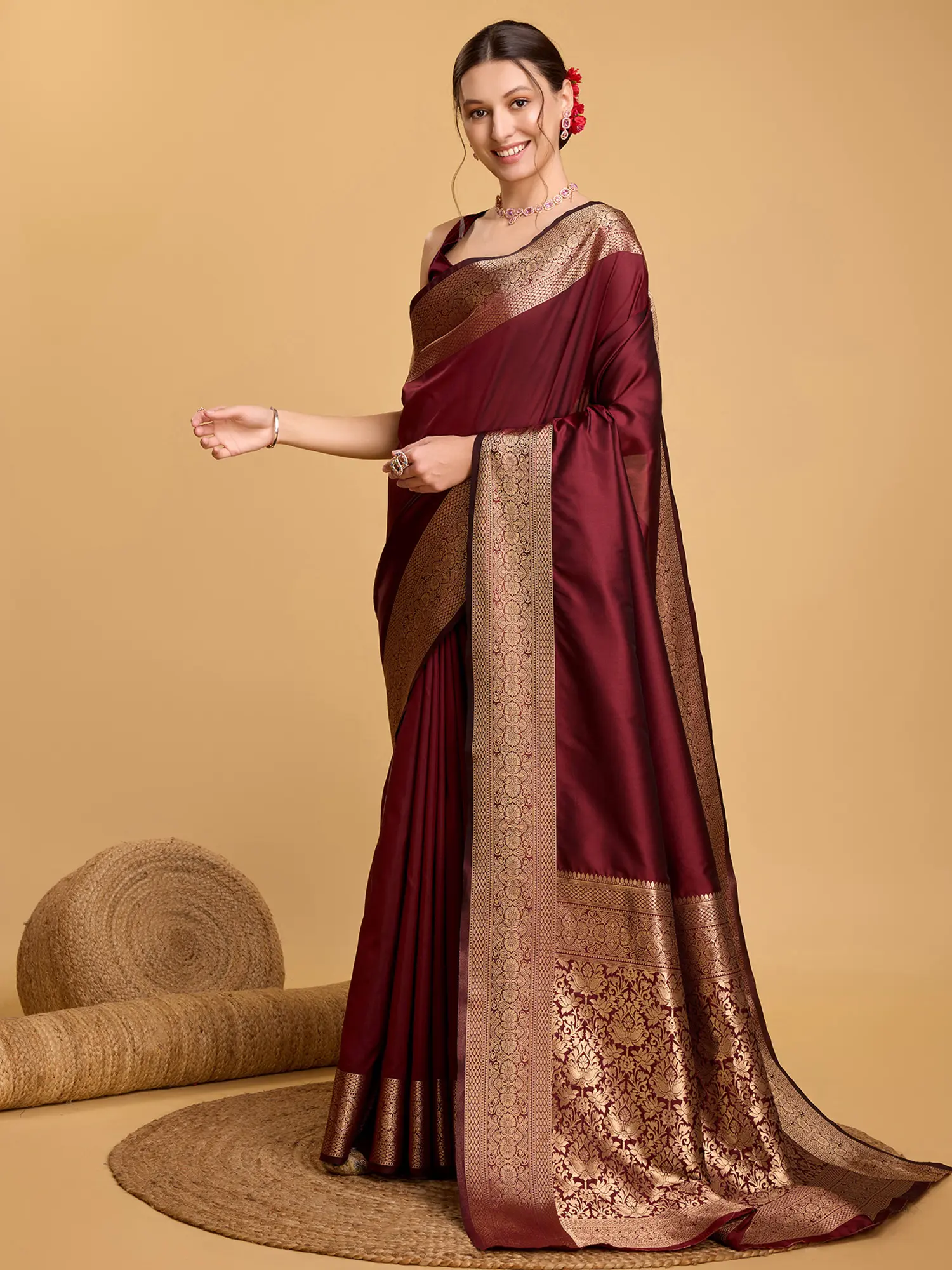 Woven Floral Motifs Contrast Border Banarasi Silk Saree with Blouse
