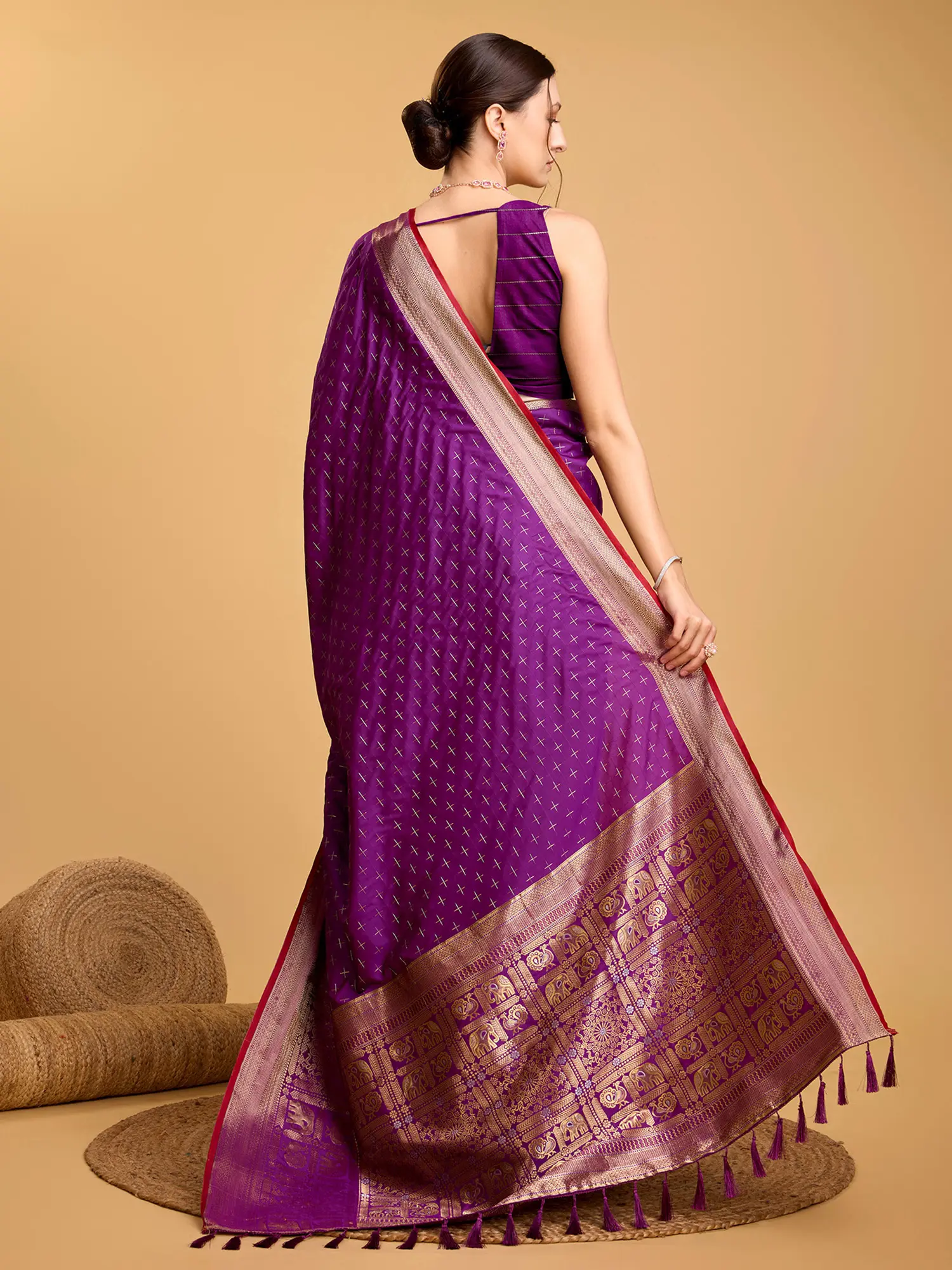 The magic of this saree lies in its detailed craftsmanship. The body of the saree is delicately patterned with a subtle cross motif in a contrasting thread, creating a sophisticated texture that catches the light beautifully. However, the true showstopper is the wide, elaborate border. This border is a masterpiece of weaving, featuring traditional motifs that evoke a sense of heritage and grandeur. Intricate patterns, possibly depicting stylized flora or fauna, are woven in shimmering gold thread, exuding an aura of luxury. A fine red piping accentuates the edges of the border, adding a vibrant touch and further defining the exquisite design. The pallu, the decorative end of the saree, carries this intricate border design, ensuring a consistent and breathtaking visual appeal from every angle.