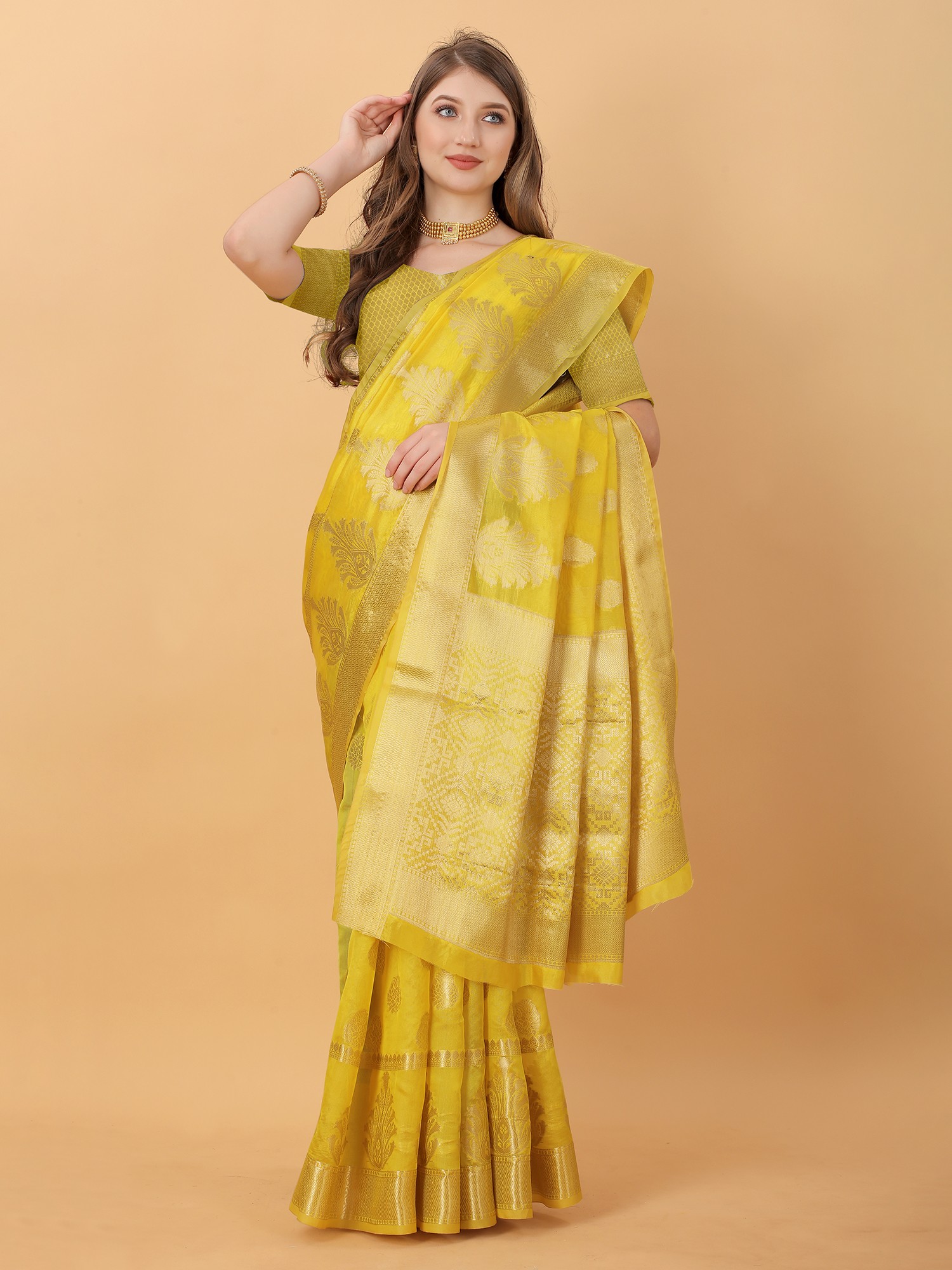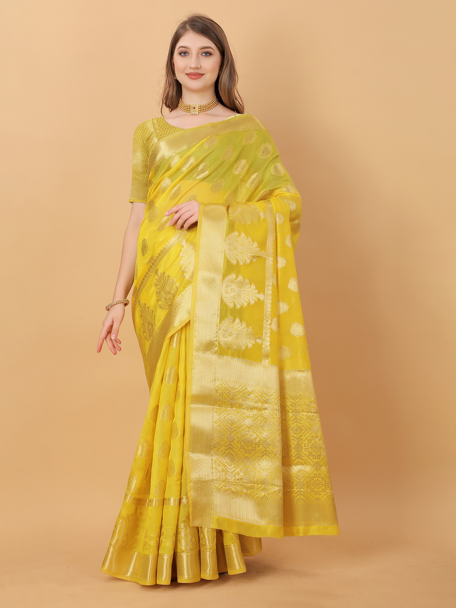The beauty of this saree lies in its intricate details. The saree features beautiful woven floral motifs, adding a dimension of graceful sophistication. The elaborate border frames the saree beautifully, enhancing its overall regal appearance. The delicate weaving showcases a keen eye for detail, where every element contributes to a symphony of elegance.